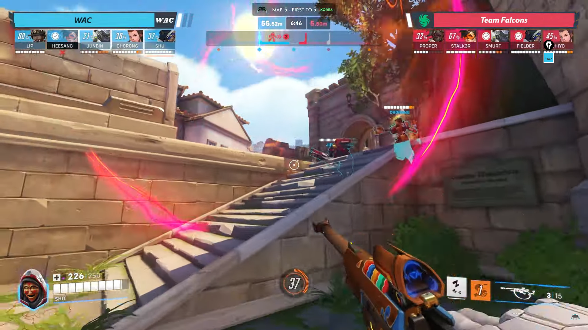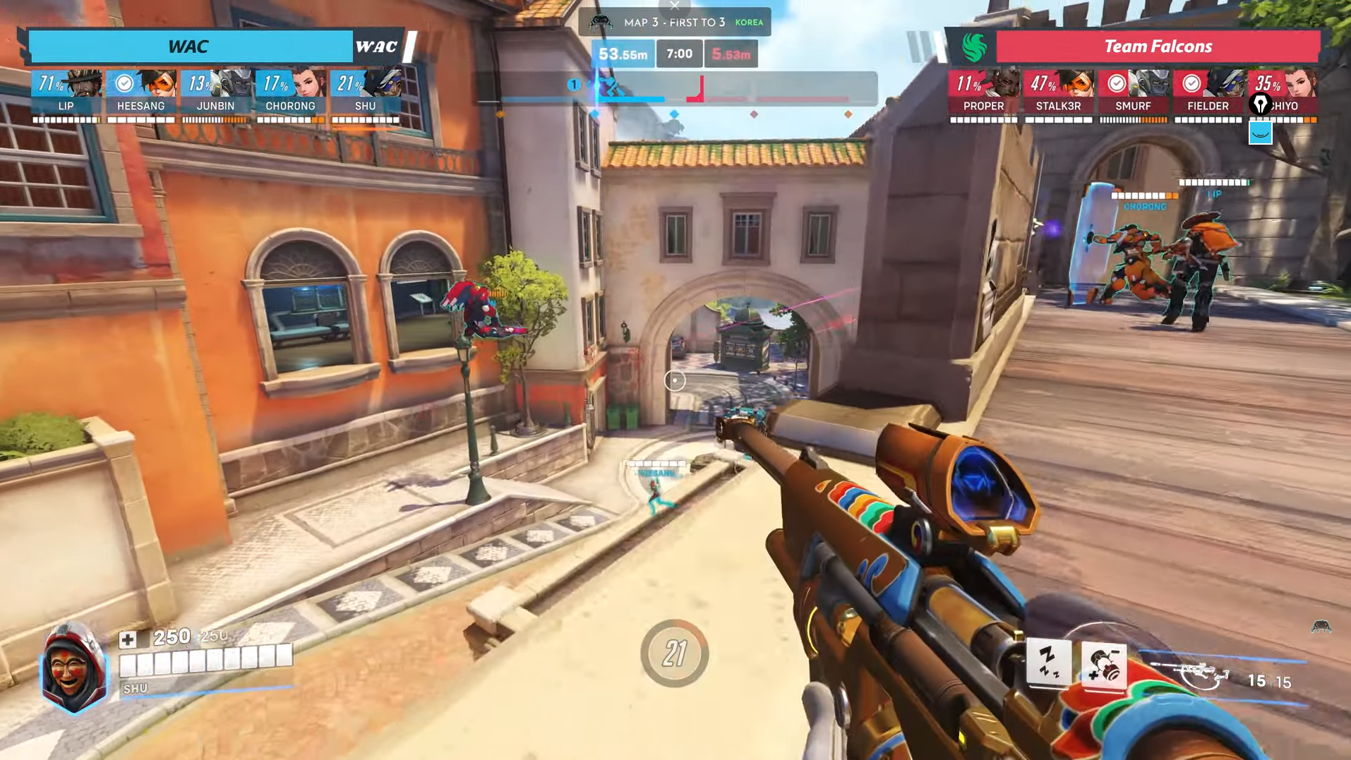 この繰り返されるリズムこそがShuの強みであり、オーバーウォッチにおけるサポートポジショニングの模範と言える。