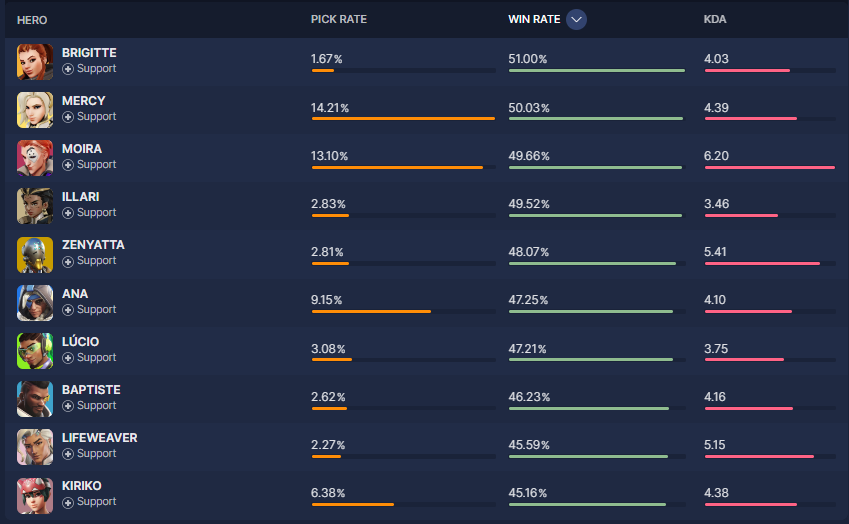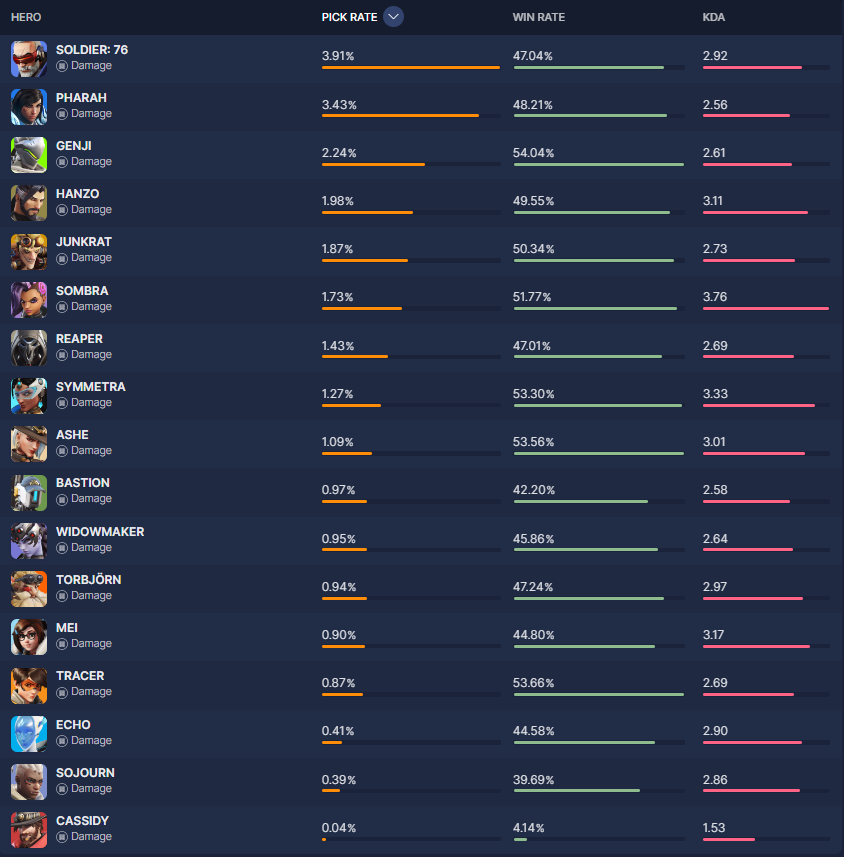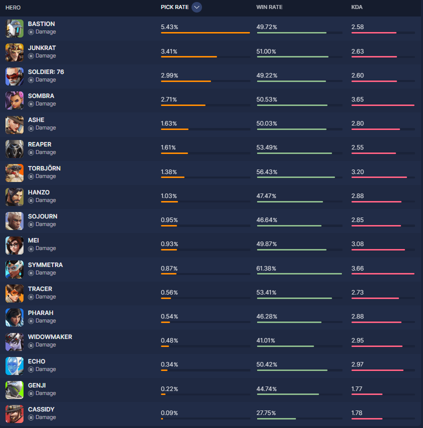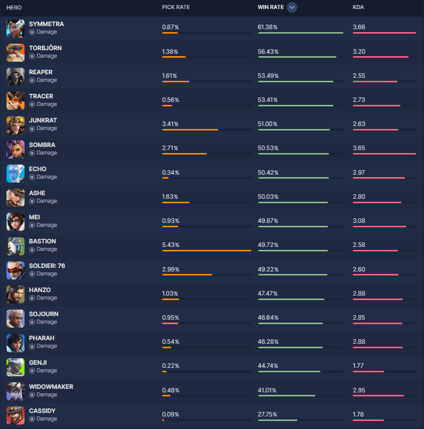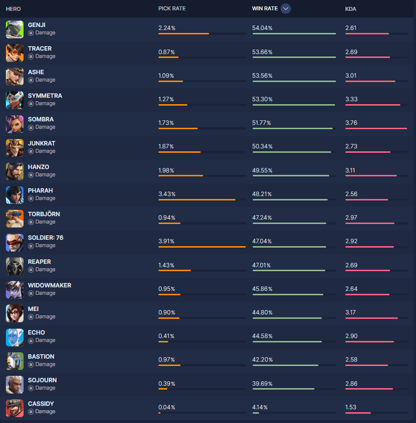 overbuff.comによると現在の『ヒーローの使用率及び勝率』は現在の下記の様になっているとの事です。