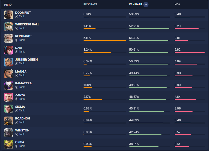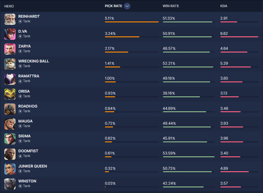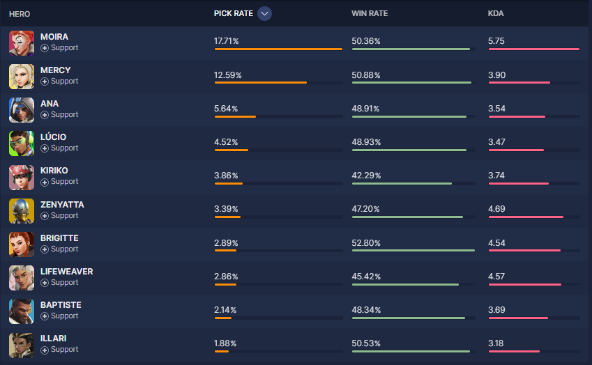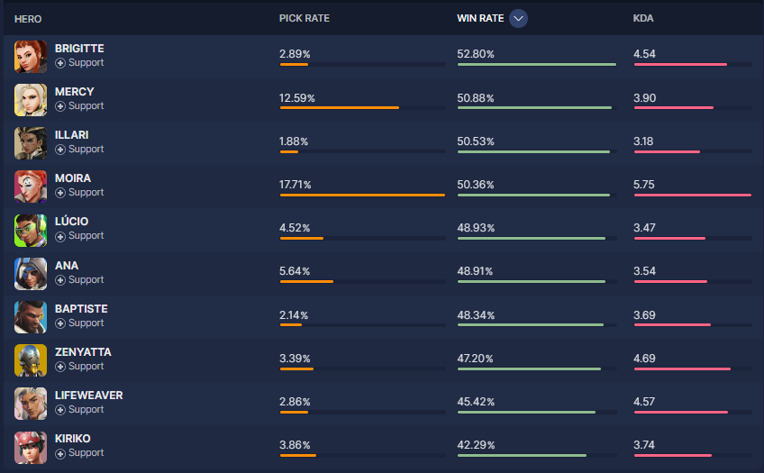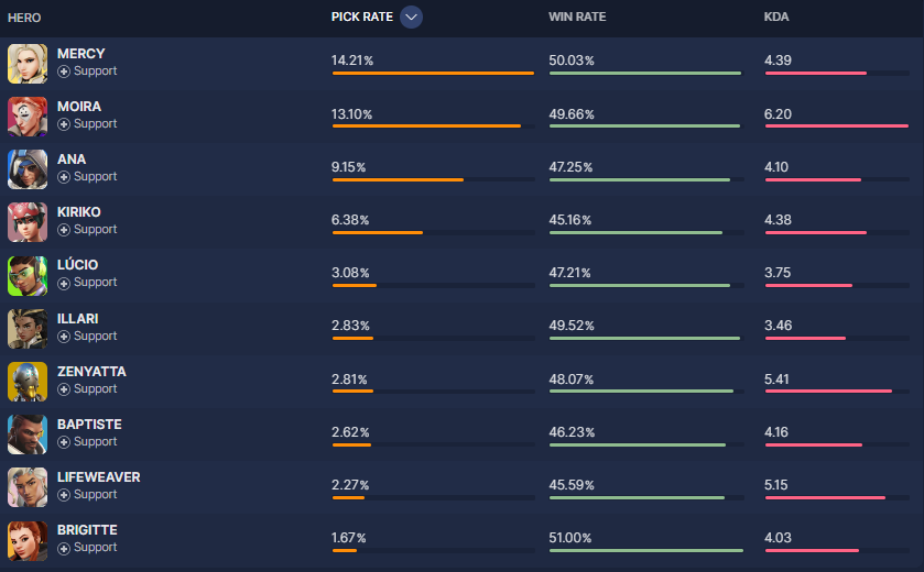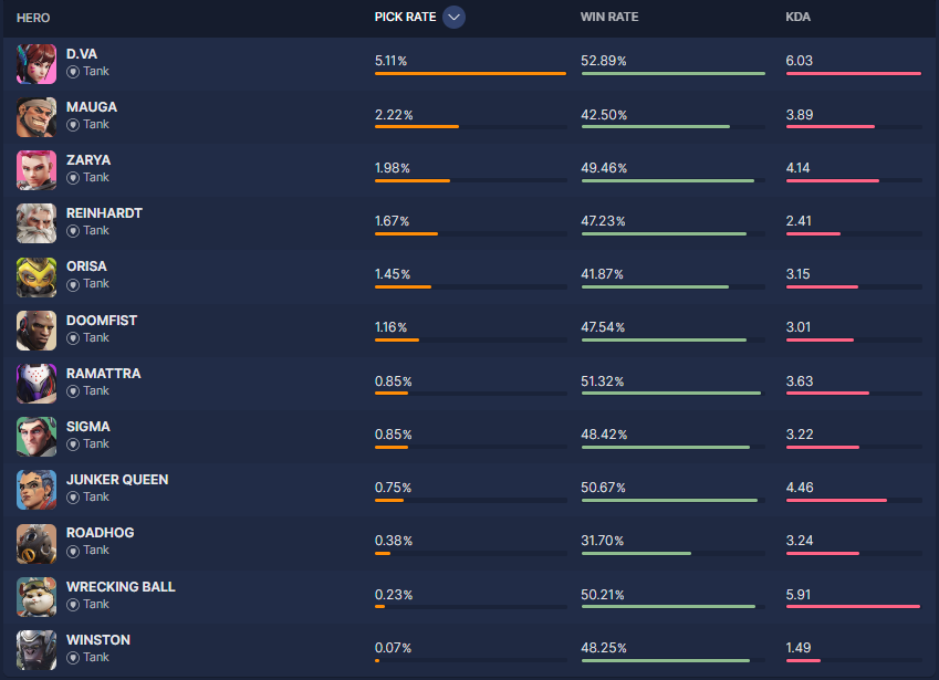 overbuff.comによると現在の『ヒーローの使用率及び勝率』は現在の下記の様になっているとの事です。