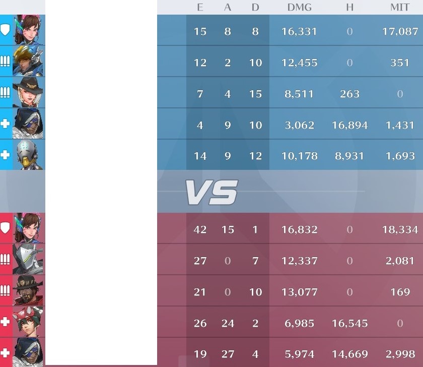 相手のダメージとサポがキル数並んでるところを見ると、おそらく相手はタンクサポが固まって動いててダメージは回復の恩恵少な目で動いてたんだと思う。