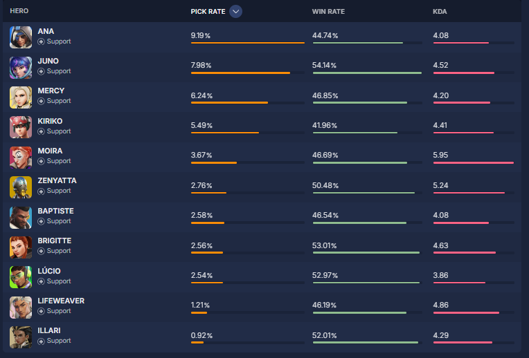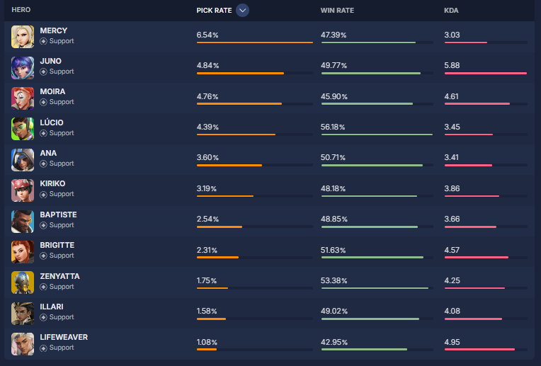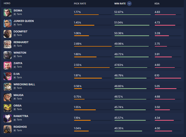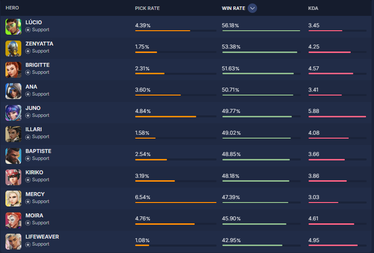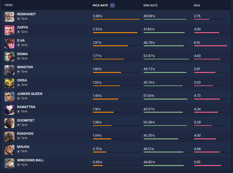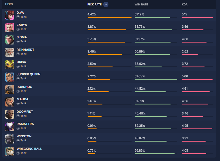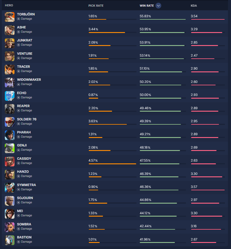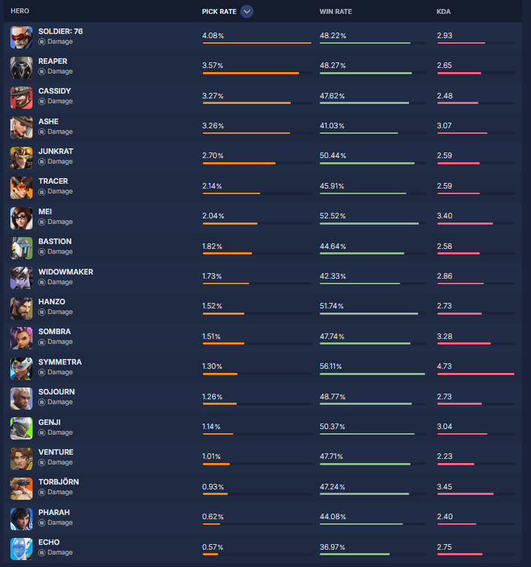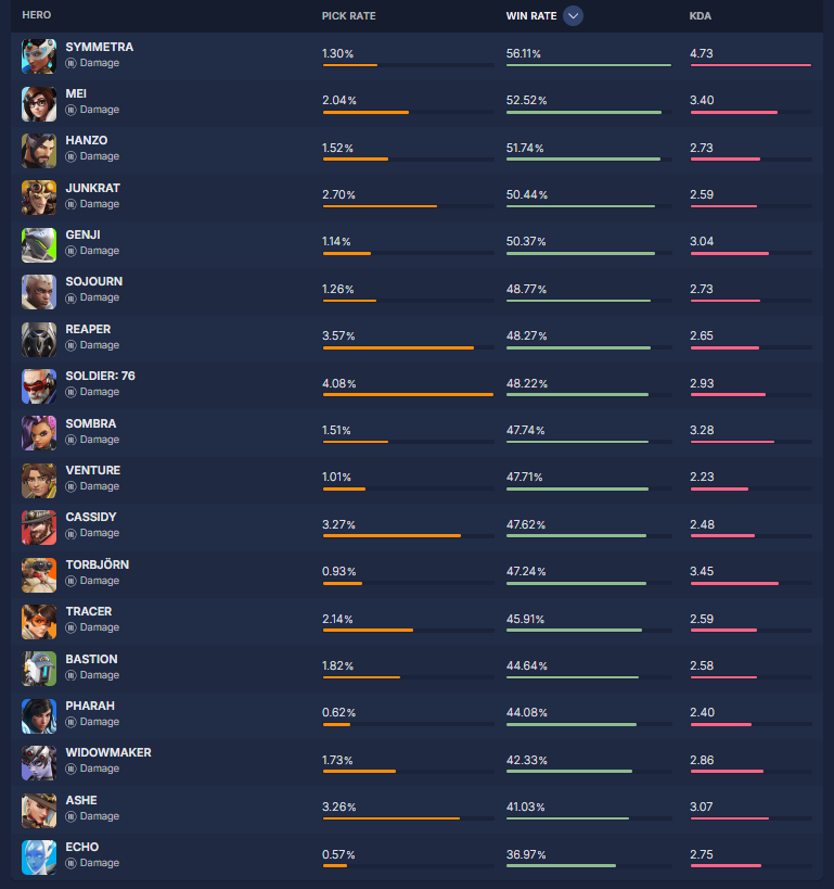 overbuff.comによると現在の『ヒーローの使用率及び勝率』は現在の下記の様になっているとの事です。