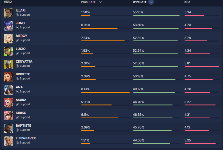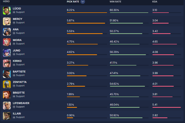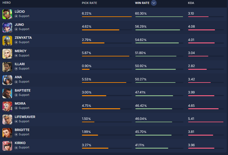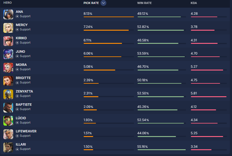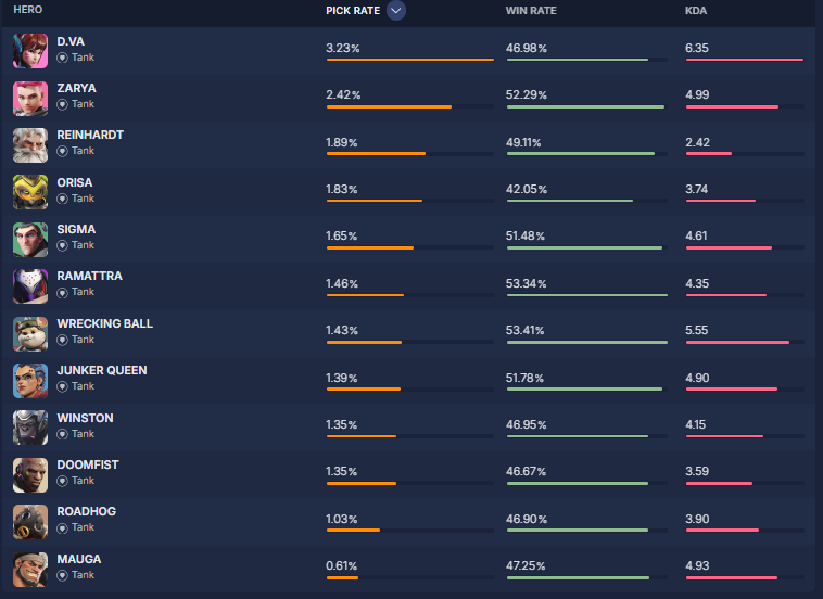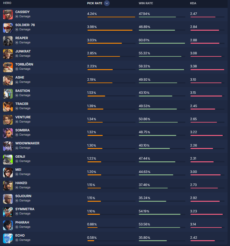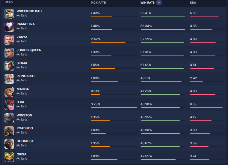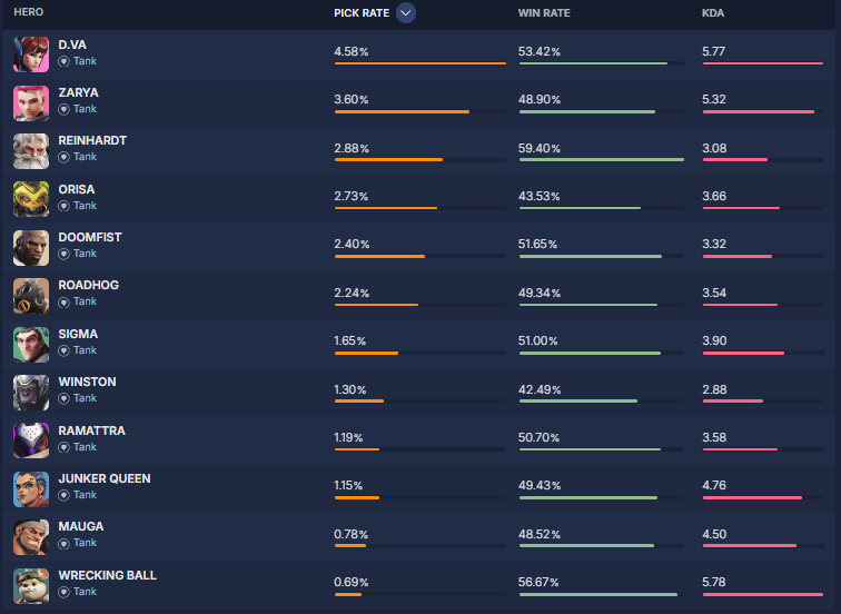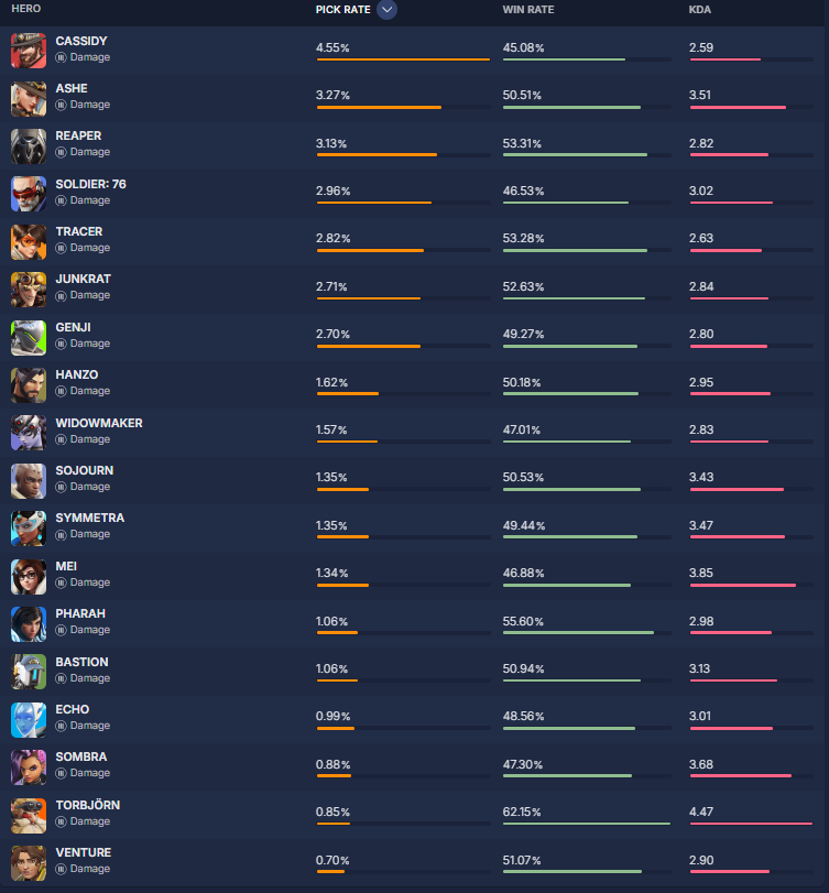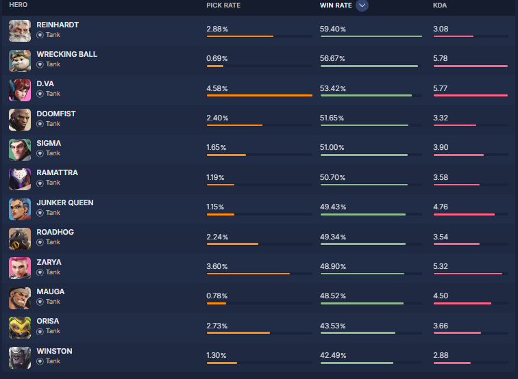 overbuff.comによると現在の『ヒーローの使用率及び勝率』は現在の下記の様になっているとの事です。