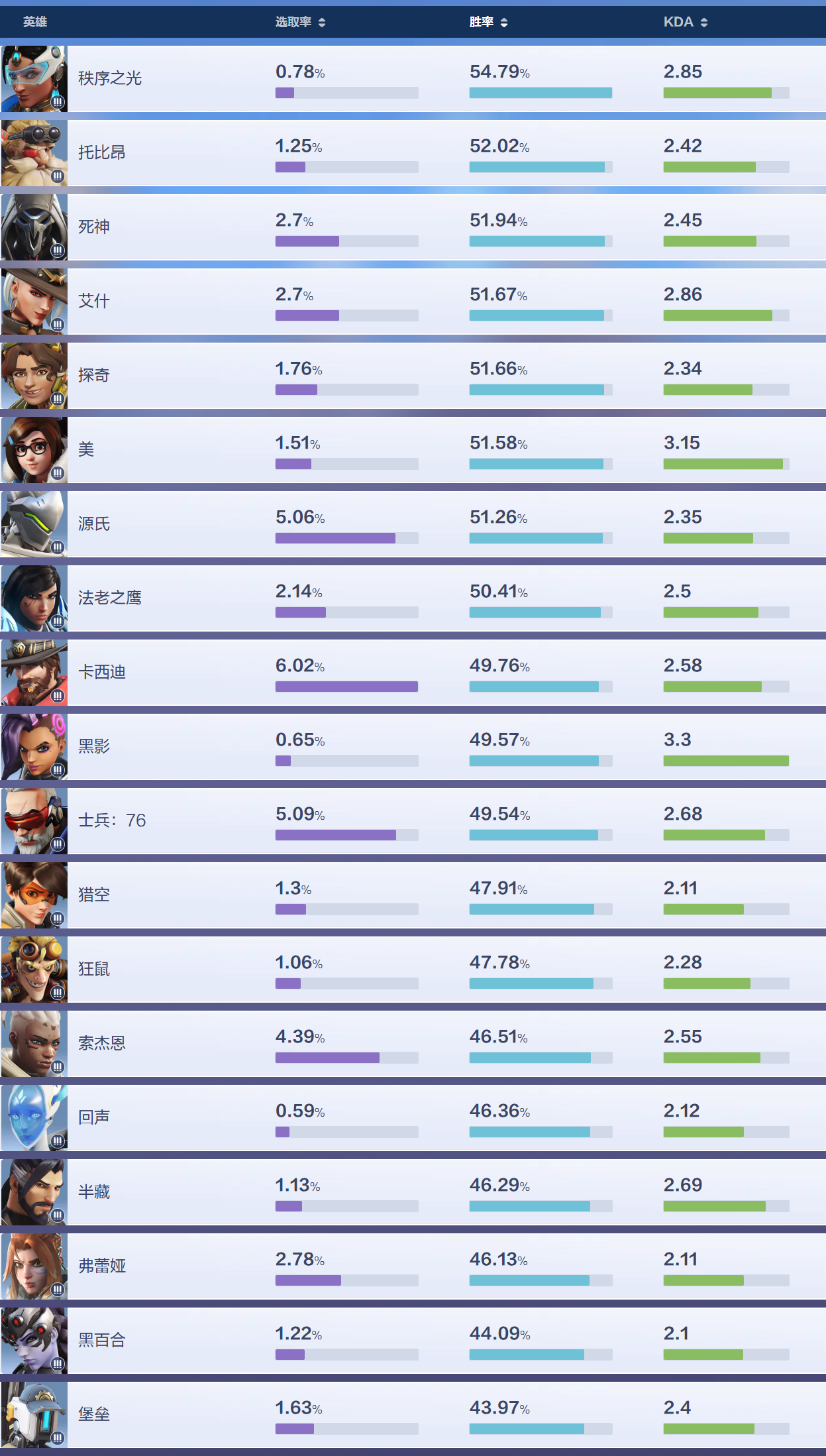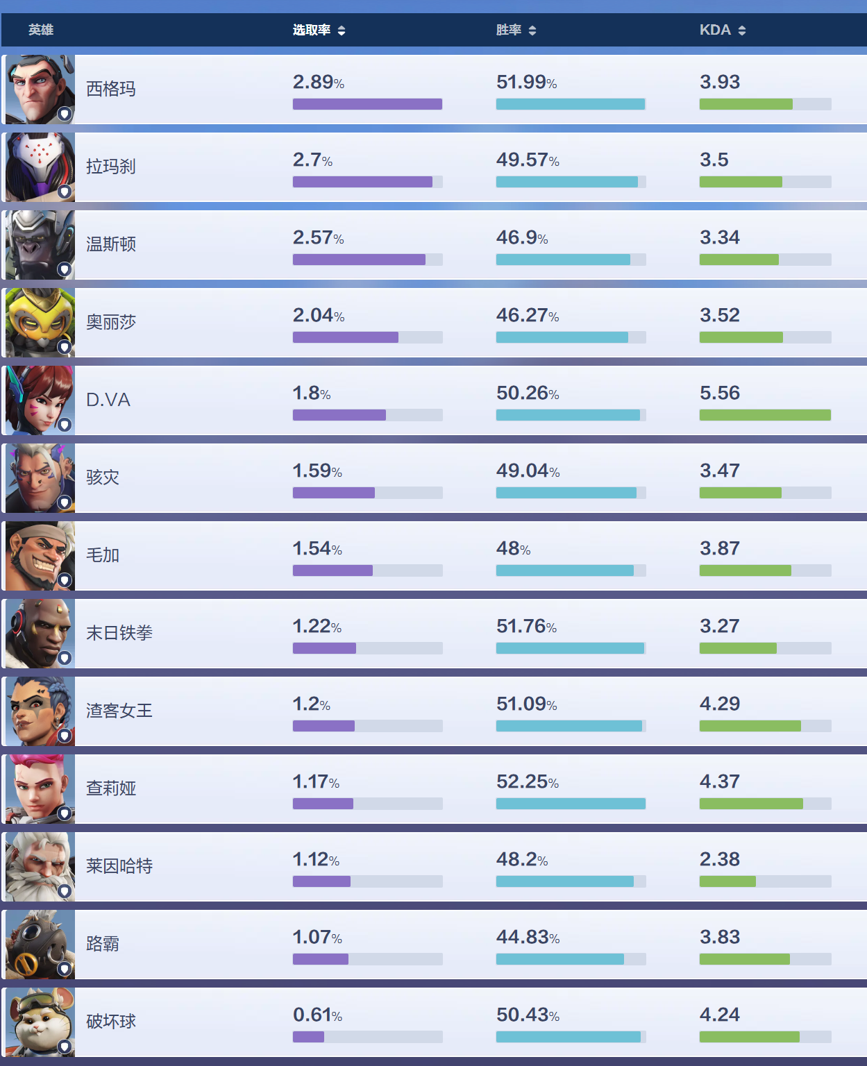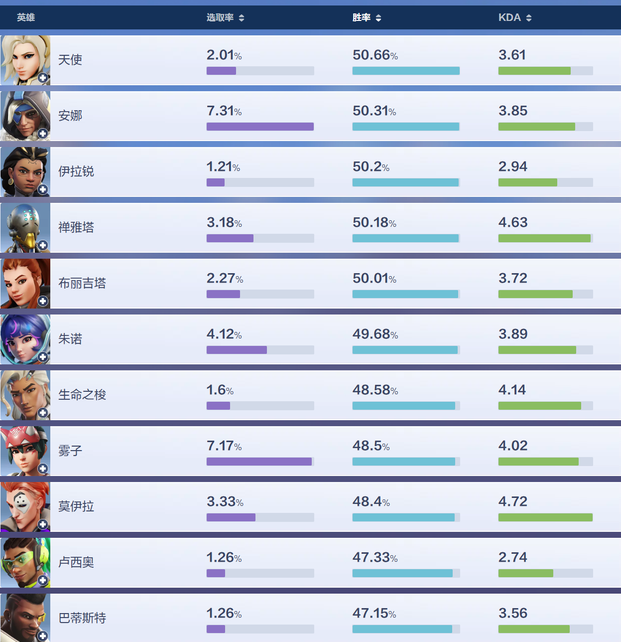 overbuff.comによると現在の『ヒーローの使用率及び勝率』は現在の下記の様になっているとの事です。
