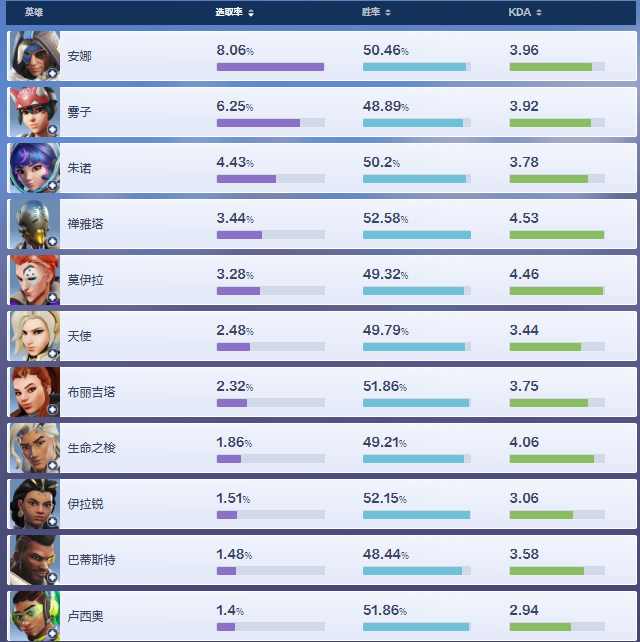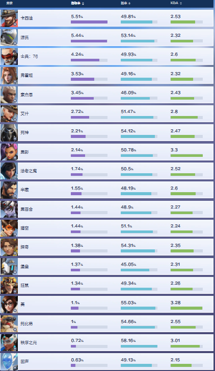 overbuff.comによると現在の『ヒーローの使用率及び勝率』は現在の下記の様になっているとの事です。