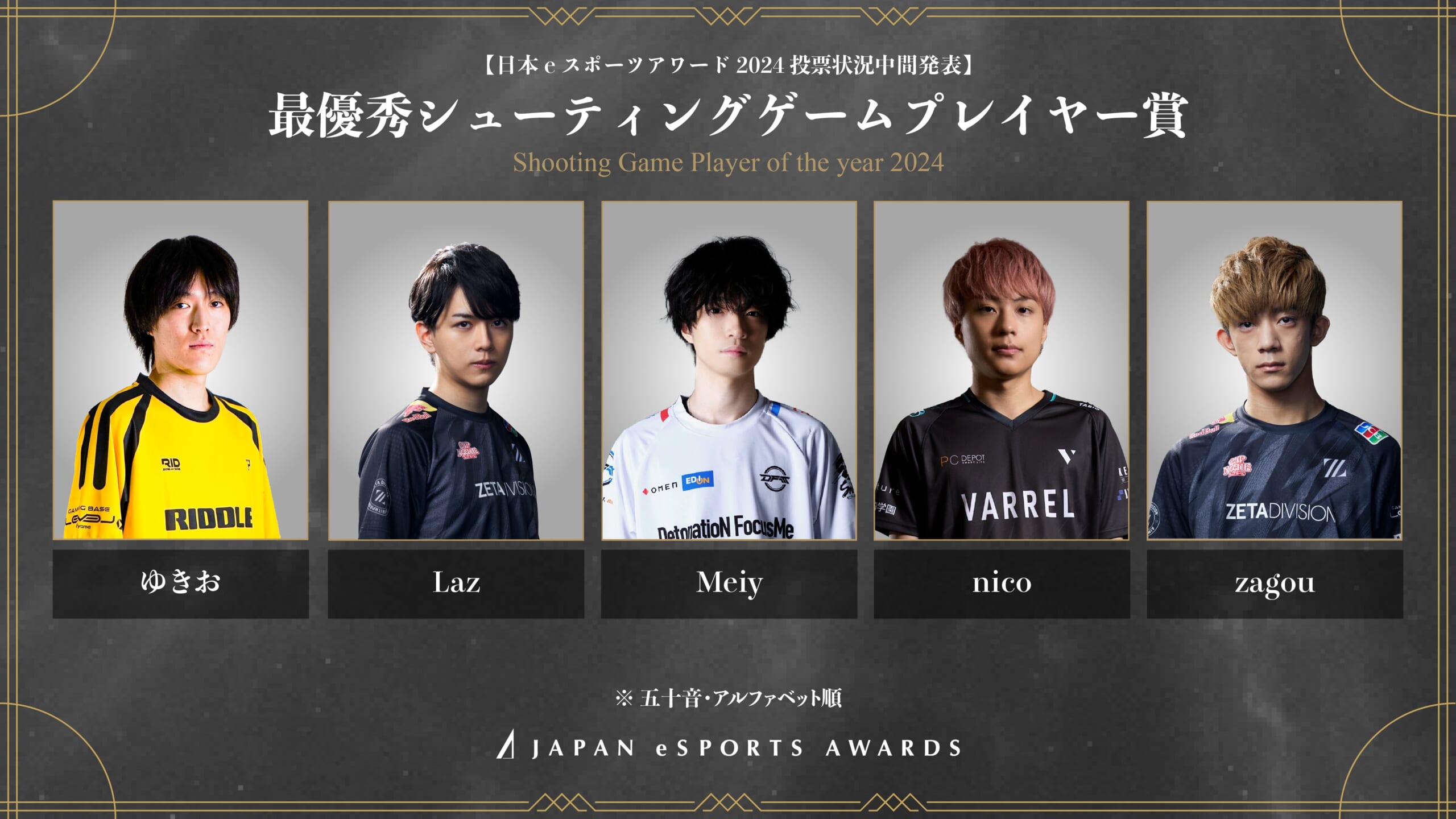 日本eスポーツアワード「最優秀シューティングゲームプレイヤー賞」の得票数上位はこちらの選手となります。