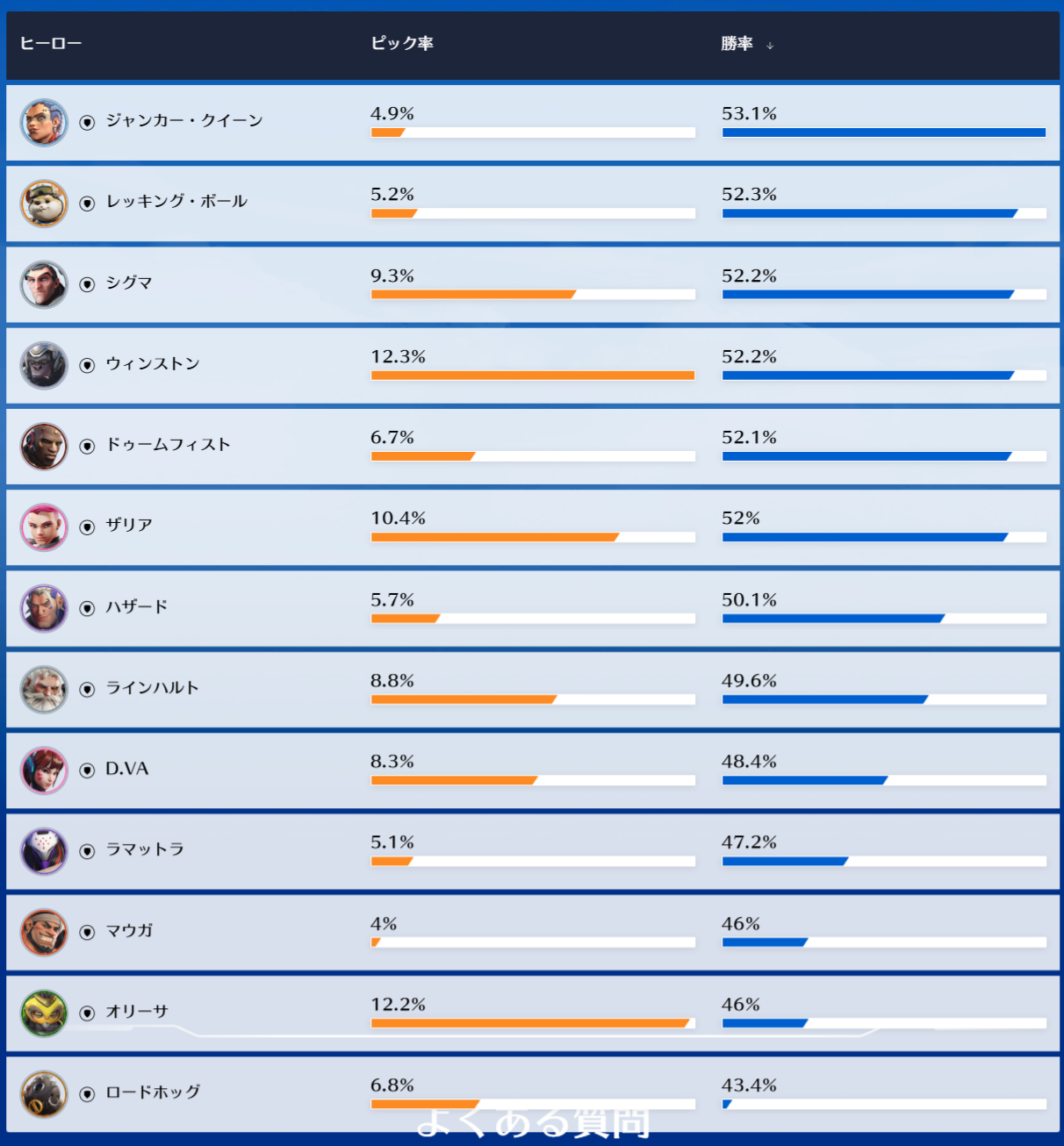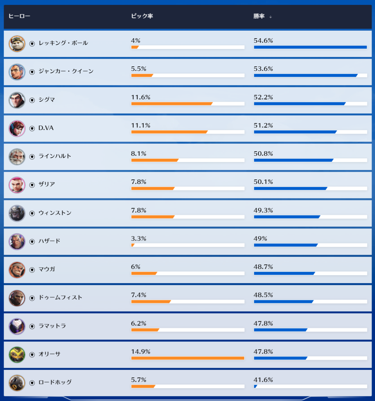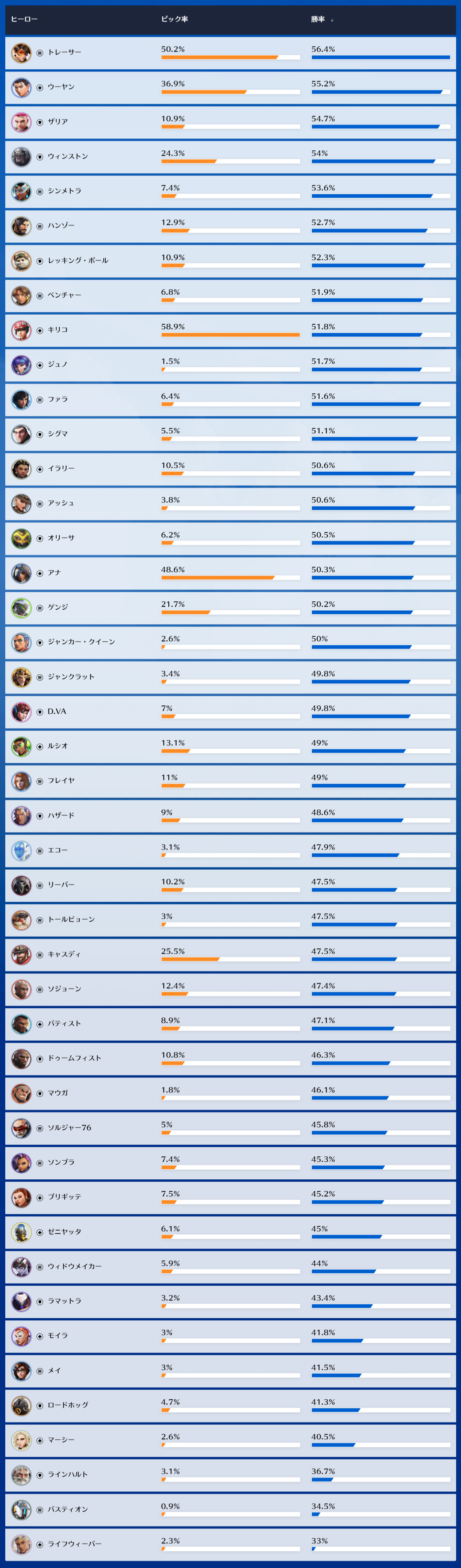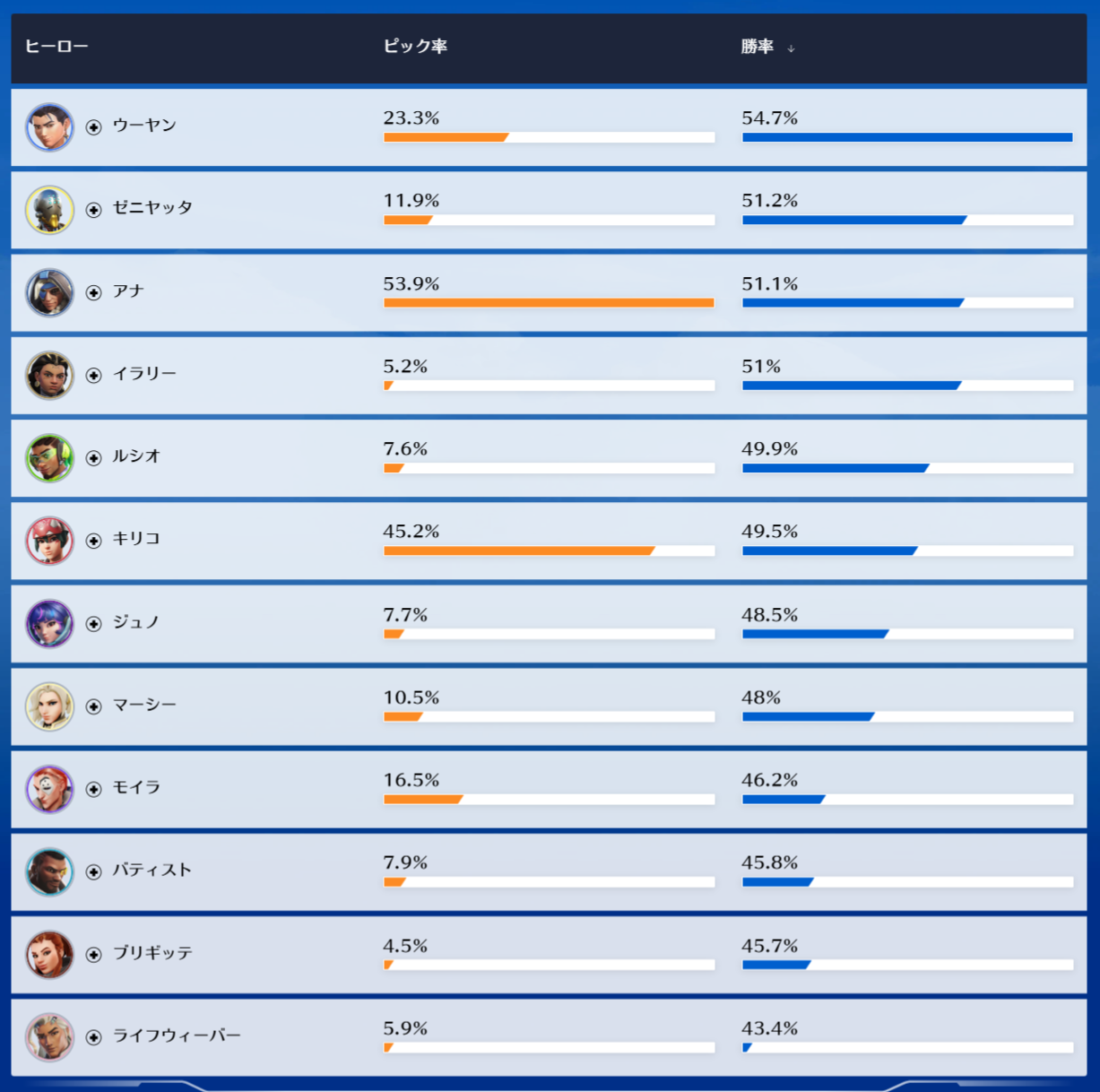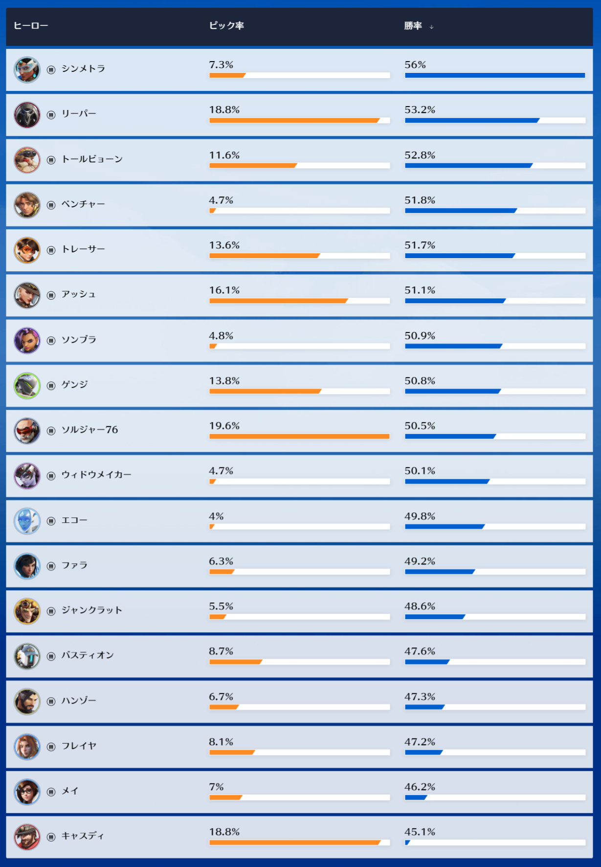 公式統計によると現在の『ヒーローの使用率及び勝率』は現在の下記の様になっているとの事です。