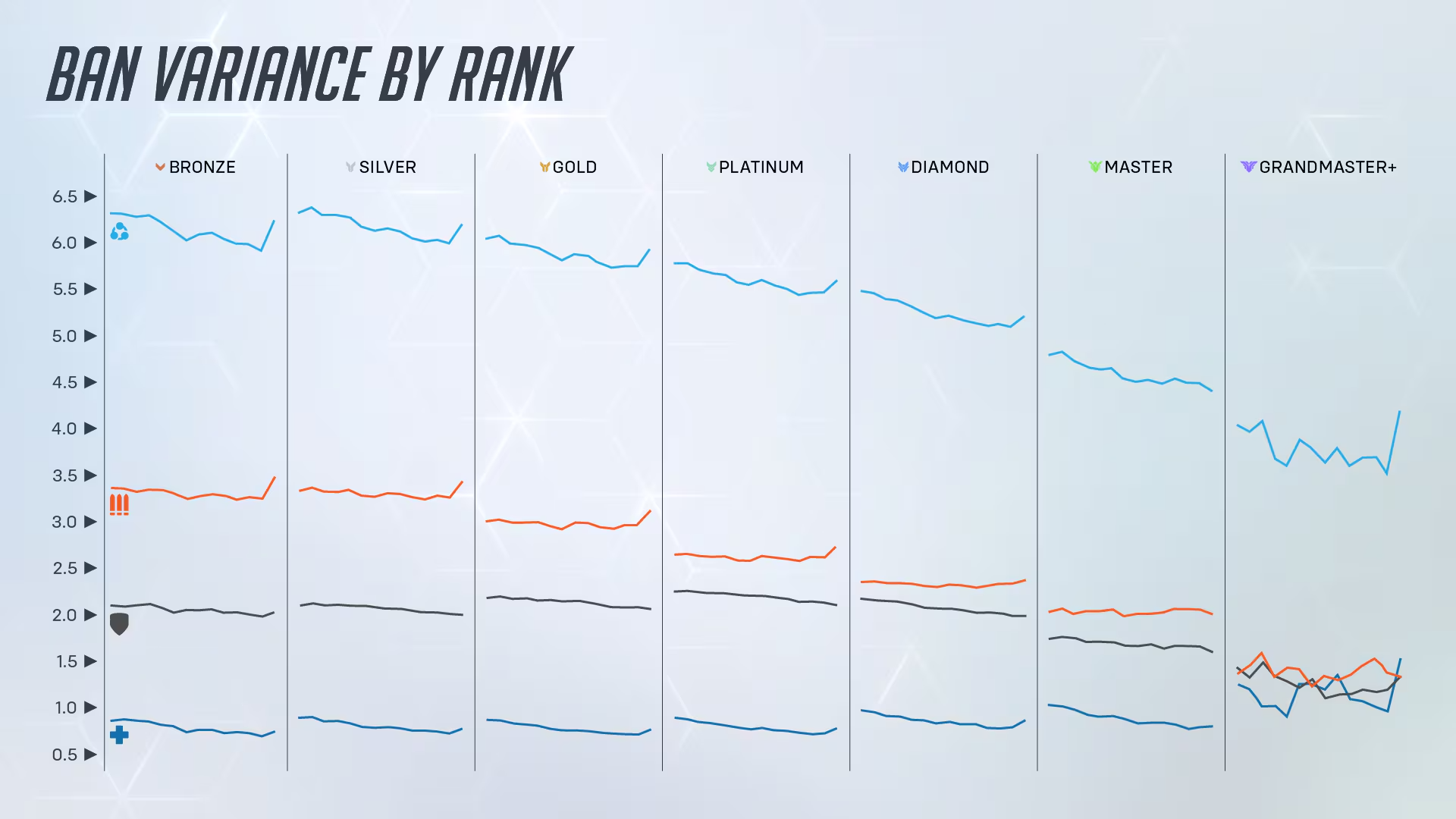 その一方ブロンズでは、BANに投票されるヒーローがチームごとに約6人と、チーム内での意見の不一致が大きめです。