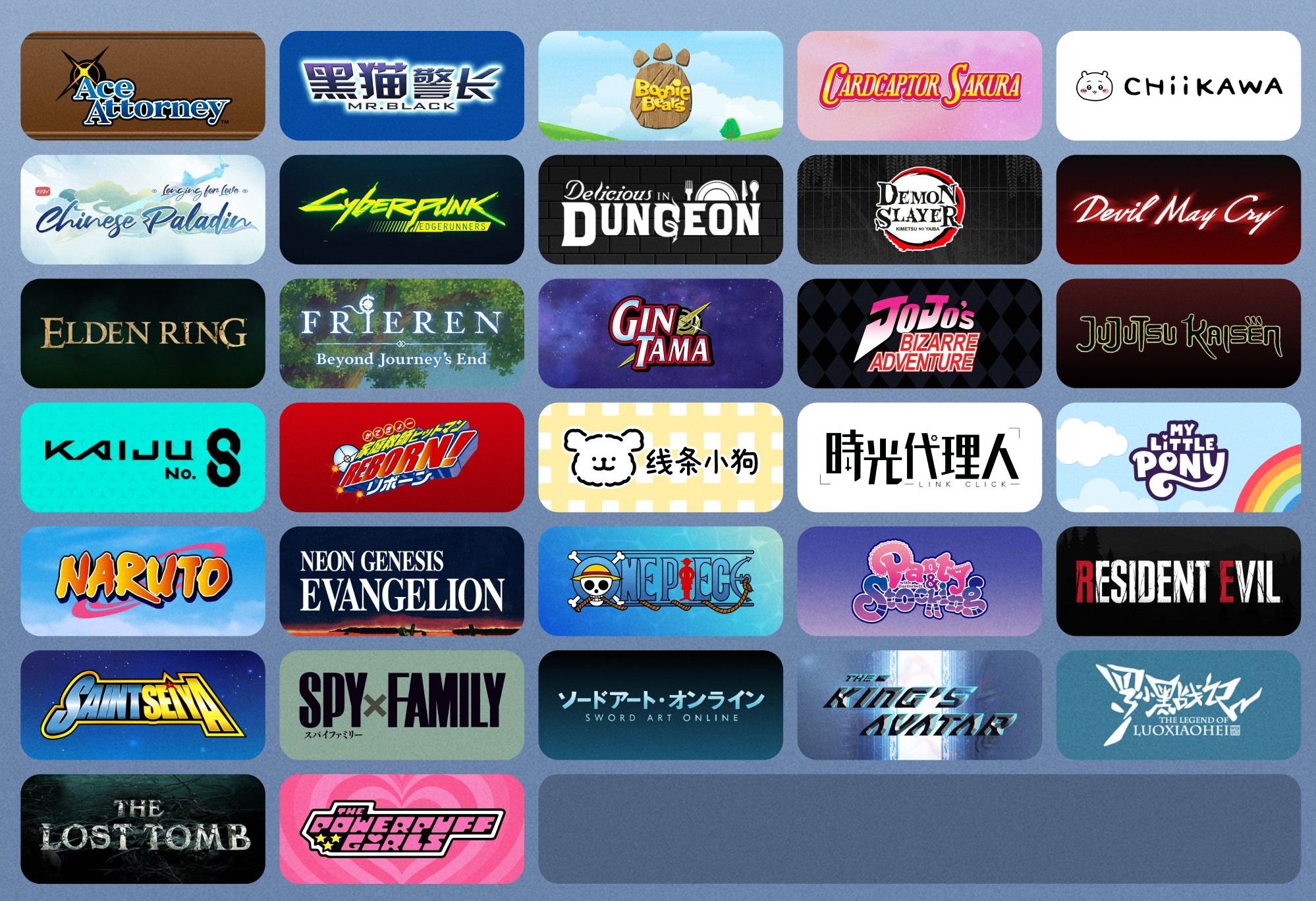 ちいかわ、サイバーパンク2077、鬼滅の刃、ジョジョの奇妙な冒険、ナルト、パワーパフガールズ、ワンピース、エヴァンゲリオン、バイオハザード、呪術廻戒など、日本や世界の人気アニメ・ゲームが多数含まれています。