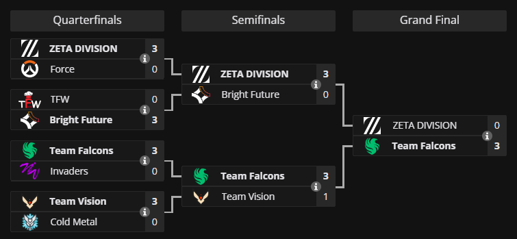 優勝したのはTEAM FALCONS。試合内容自体は競った展開になっていたものの、3マップ目のエスペランサではまさかの押し切りで結果的にはZETA DIVISION相手に3-0のストレート勝ちとなりました。