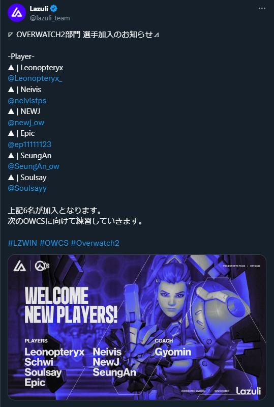 本日、LAZULI公式によってOWCS JAPANステージ3に向けた新ロスターが発表されました。
