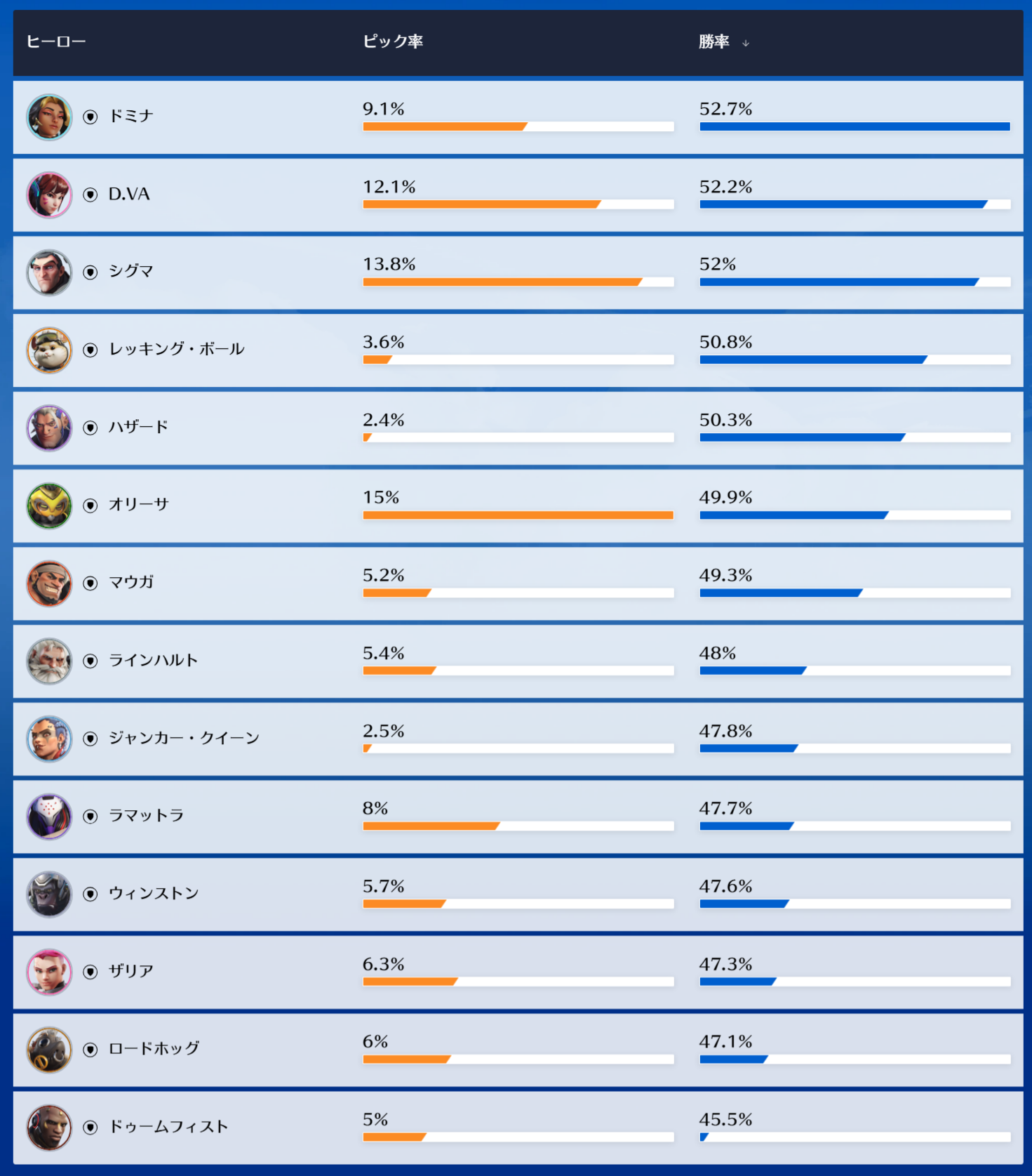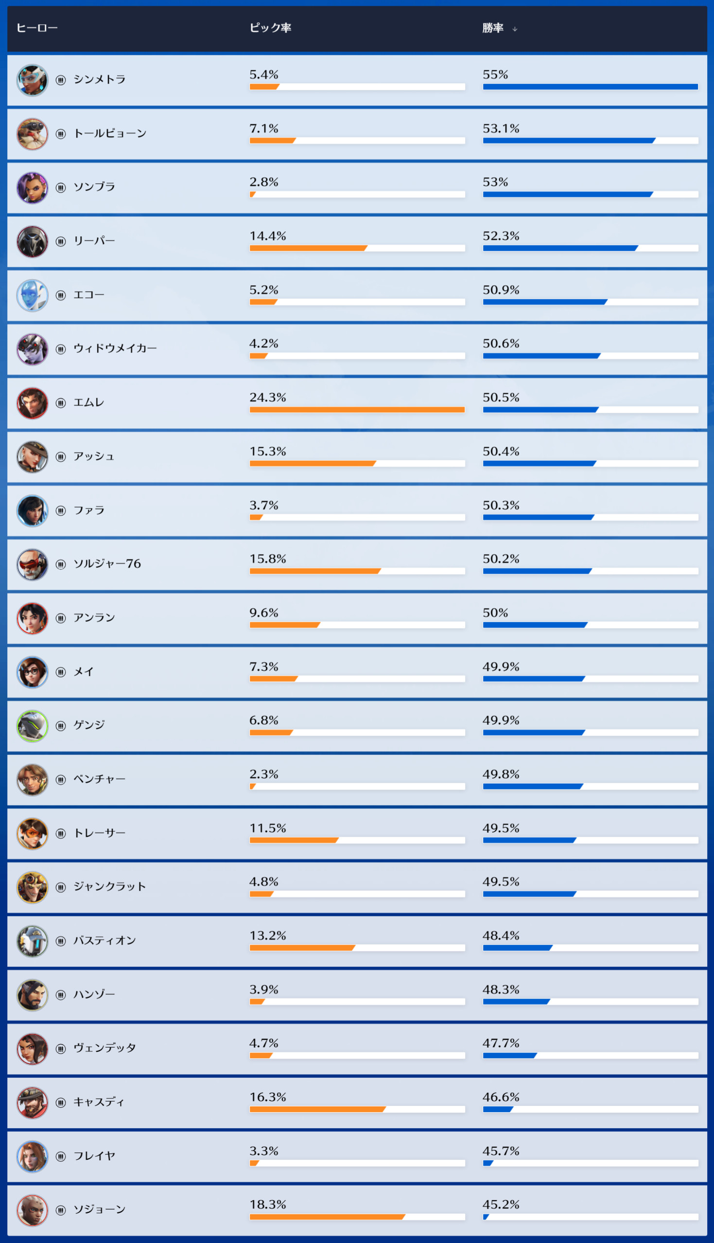 公式統計によると現在の『ヒーローの使用率及び勝率』は現在の下記の様になっているとの事です。