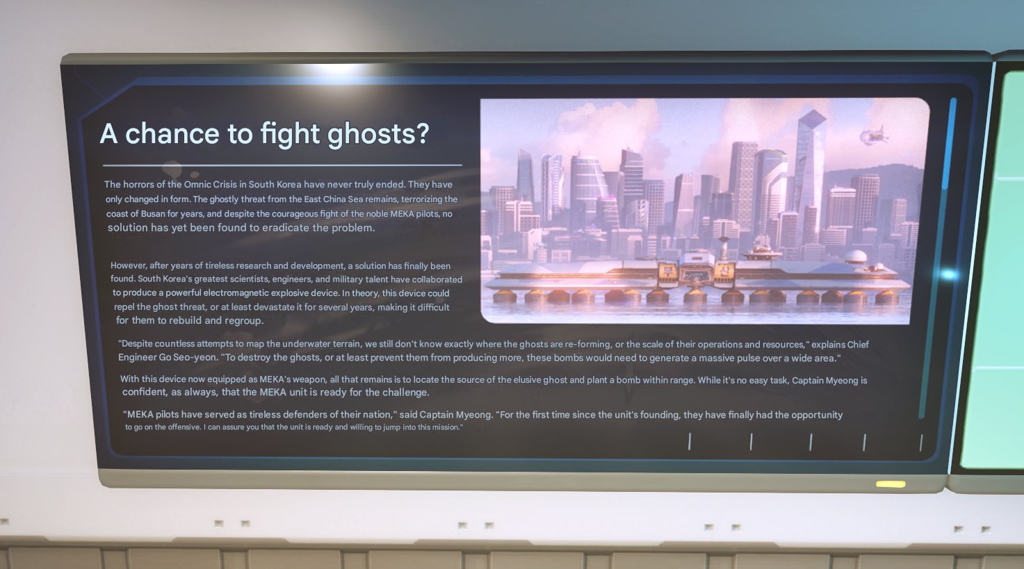 The Busan MEKA Base now features a report on a new EMP bomb designed to repel the Gwishin, detailing the MEKA squad’s upcoming mission to locate the swarm’s core and deploy the device.