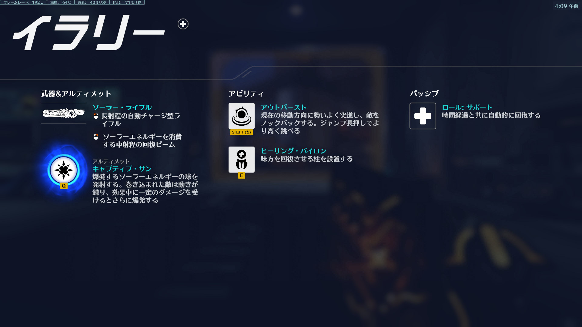 ビームヒールの射程が短いのとメインが火力不足で少なくとも壊れキャラではなかった。タレットは射程もヒール量も十分だし敵に射線通さなくていいからずっと仕事してる。ウルトは強い。ポーク+防衛だと誰よりも輝いてるけどそれ以外は微妙な気がする。俺が使えてないだけかもしれんけど