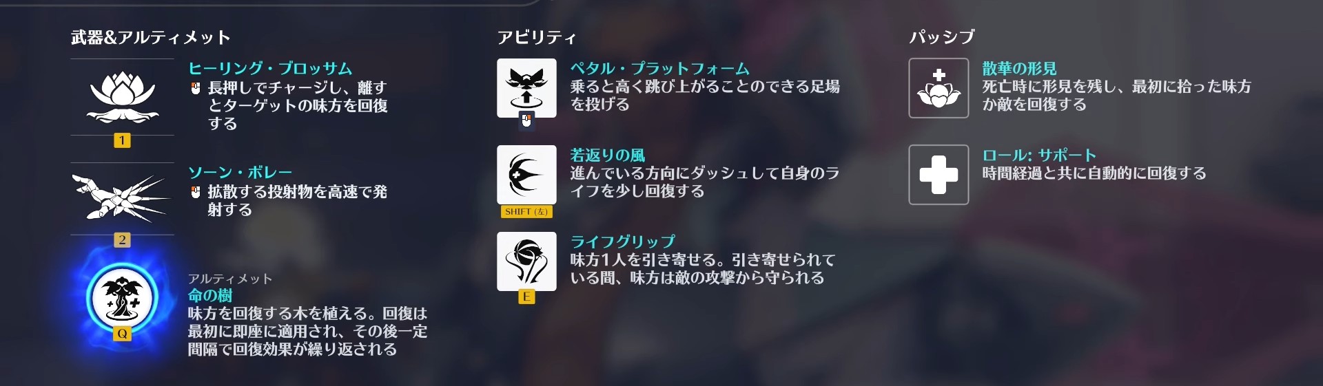 「ペタル・プラットフォーム」で味方を高所へ送り届け、「ライフグリップ」で安全な場所へ引き寄せ、「ヒーリング・ブロッサム」で傷を癒やしましょう。
