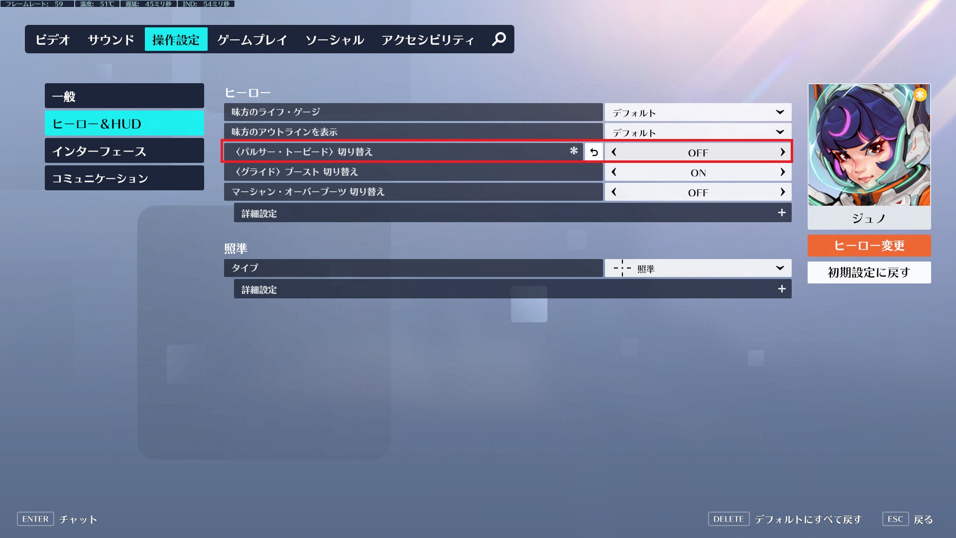 ヒーロー設定からパルサー・トーピードの切り替えをOFFに