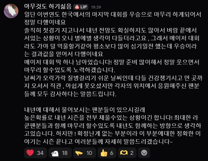 Crazy RaccoonのLip選手が自身のDiscordチャンネルでOWCS ASIAの感想と今後についてコメントしています。