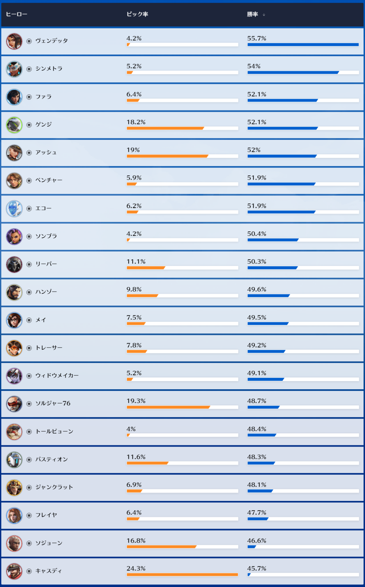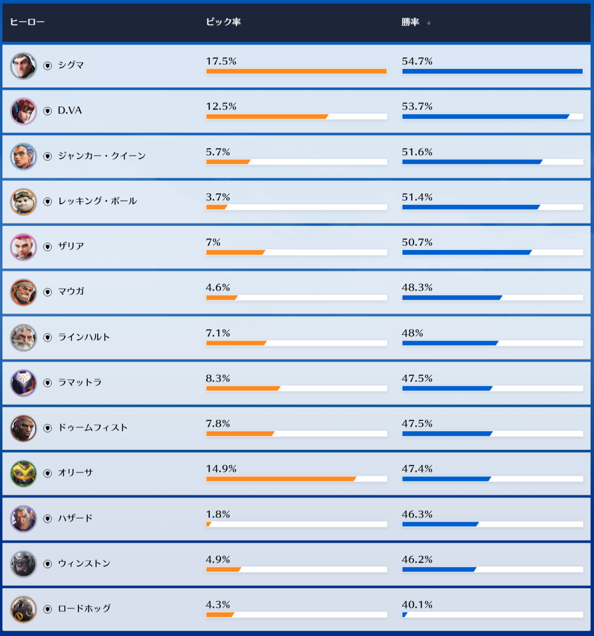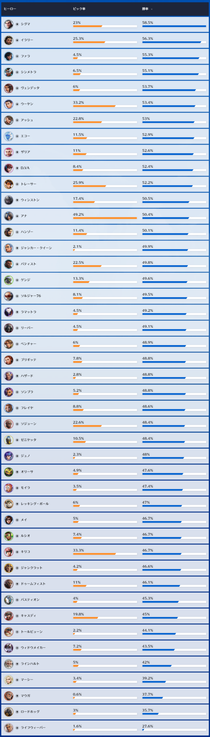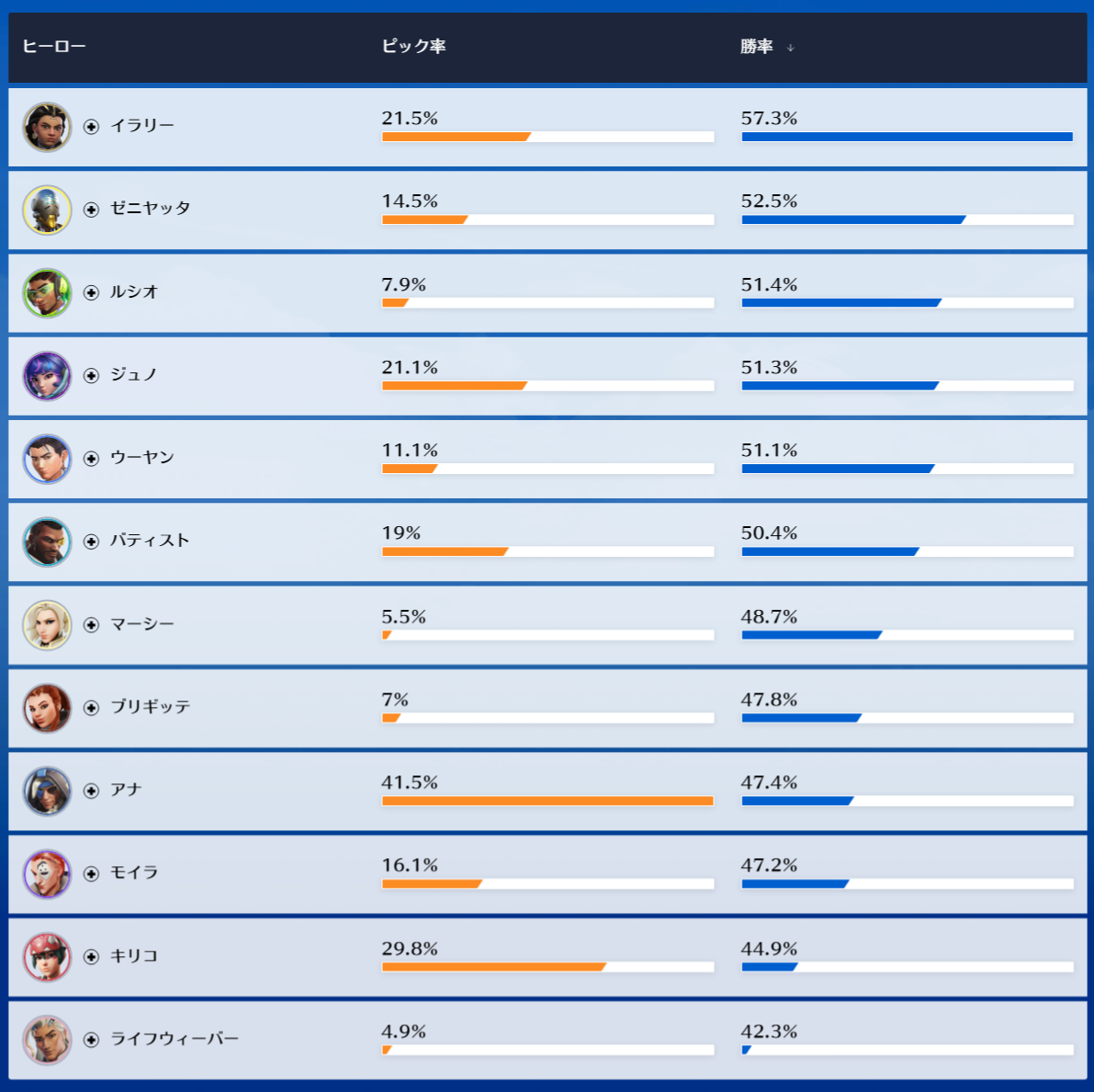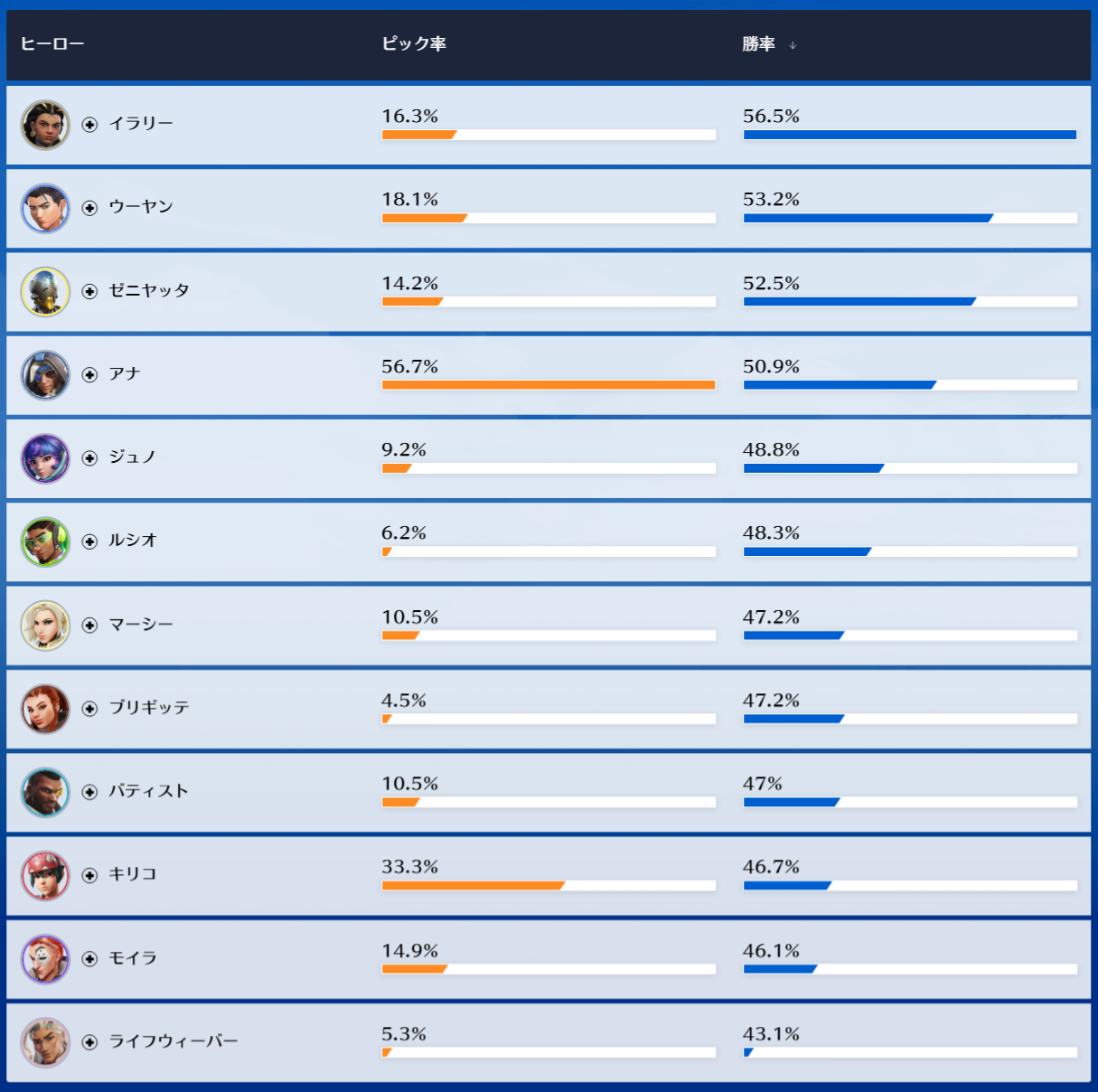公式統計によると現在の『ヒーローの使用率及び勝率』は現在の下記の様になっているとの事です。