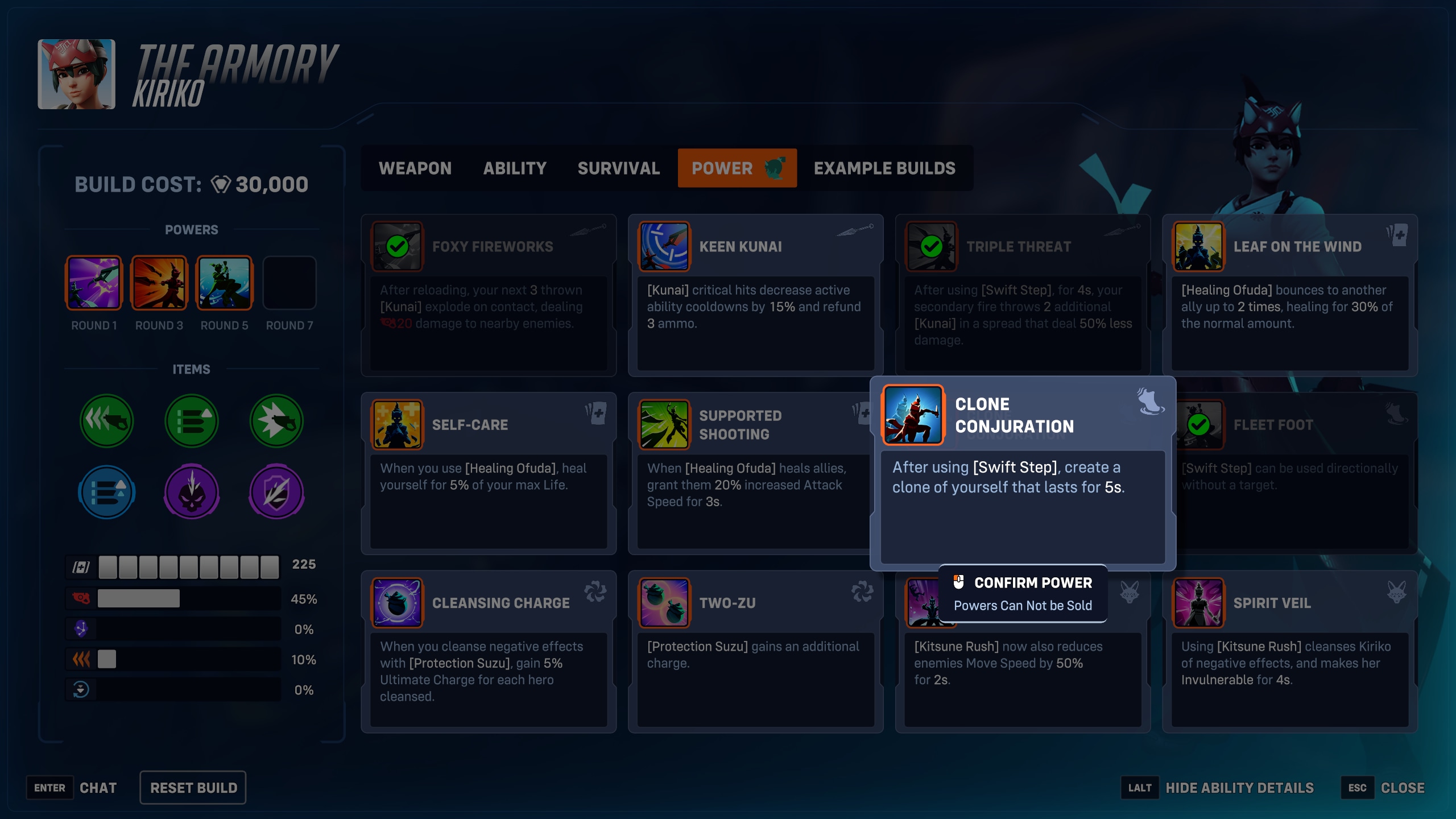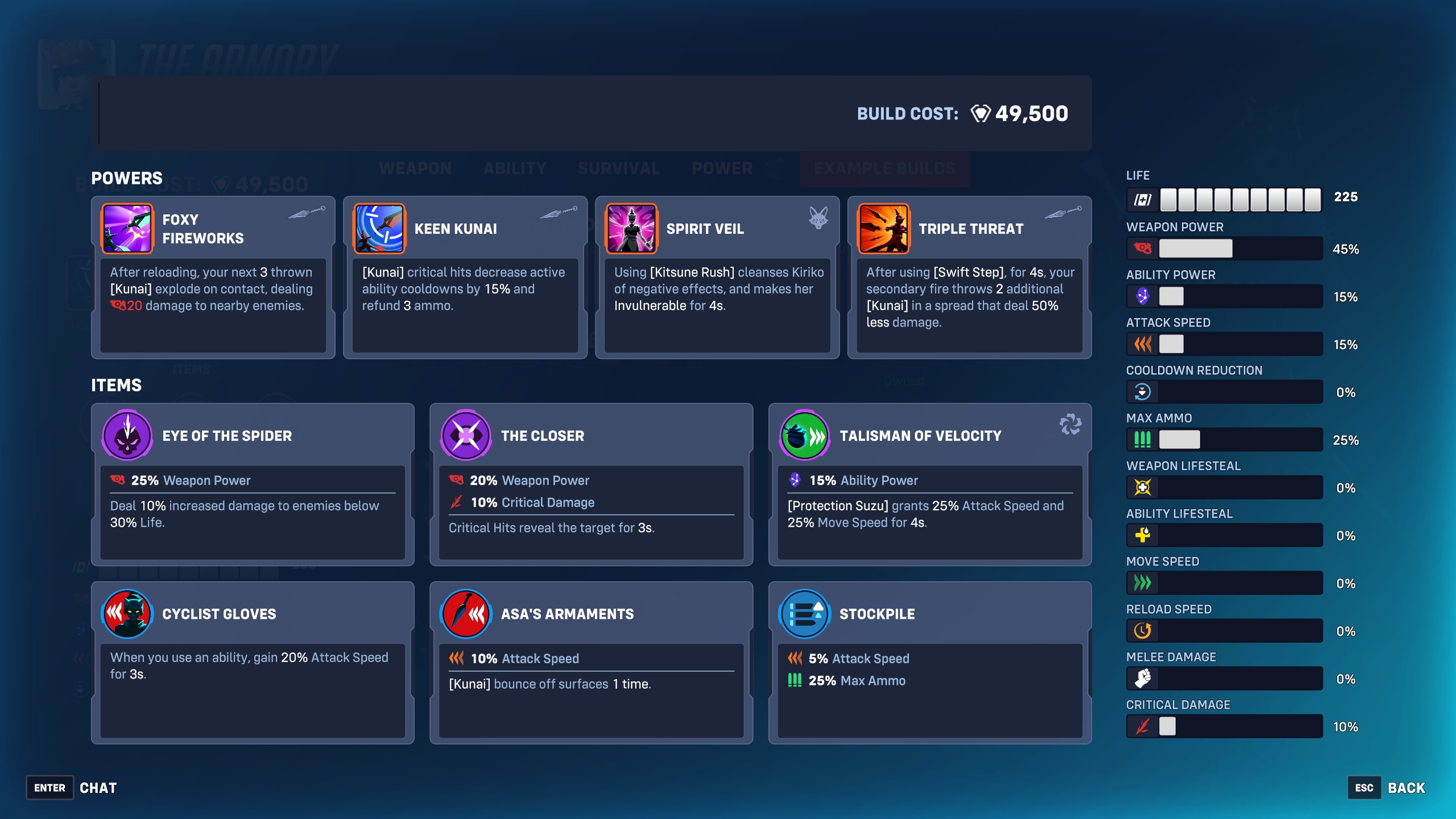 「狐火の刃」、「鋭利なクナイ」、「三重の刃」、「天の衣」などのパワーは、自動リロードや着弾時の爆発などの効果もあいまって、高度なスキルを駆使するほど威力を発揮します。