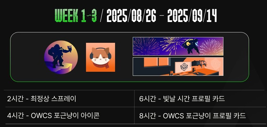 ✔️ Week 1~3 - 최정상 스프레이, 빛날 시간 프로필 카드, OWCS 포근냥이 아이콘 & 프로필 카드