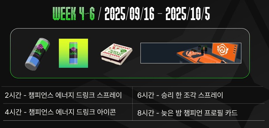 ✔️ Week 4~6 - 챔피언스 에너지 드링크 스프레이 & 아이콘, 승리 한 조각 스프레이, 늦은 밤… pic.twitter.com/9Ep9ZFn5X1