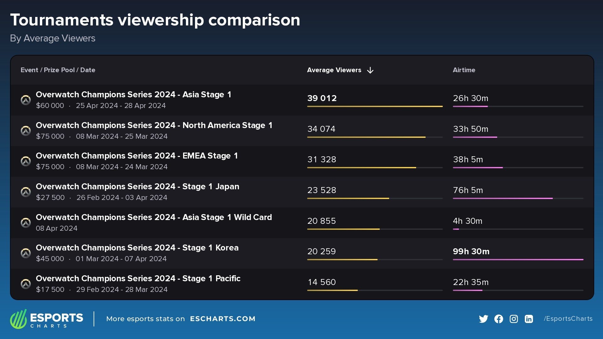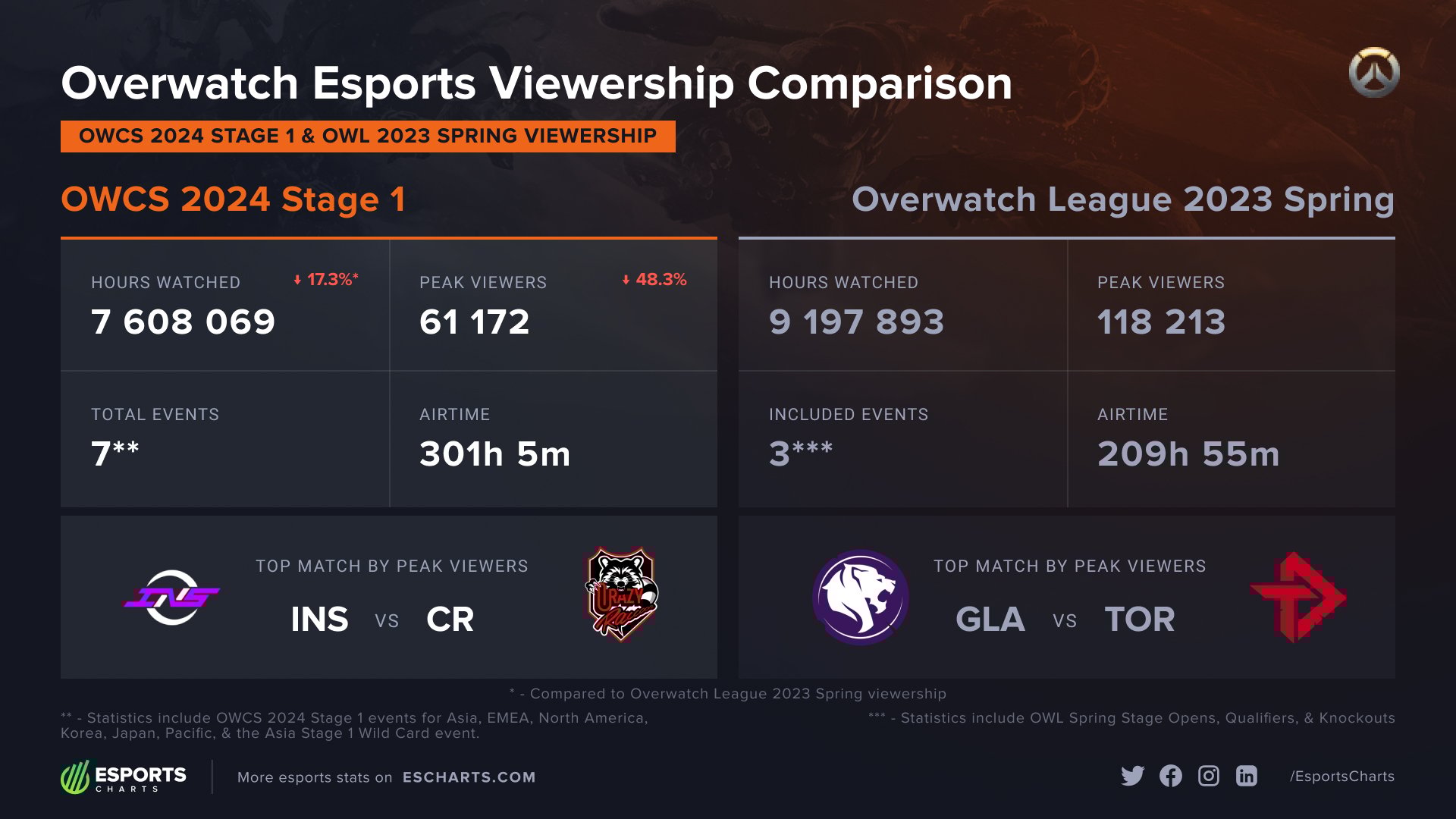 ・OWCS 2024 ステージ1では、世界中で地域別の高い視聴率を記録したが、OWL2023での春季イベントで達成された視聴者数には一歩及ばず(統計画像2)