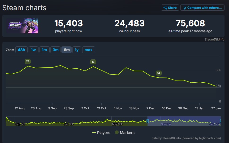 Overwatch2はマーベルライバルズ登場後7週間でSteamの平均プレイヤー数が約33,700人から約20,500人へと40%近く減少。