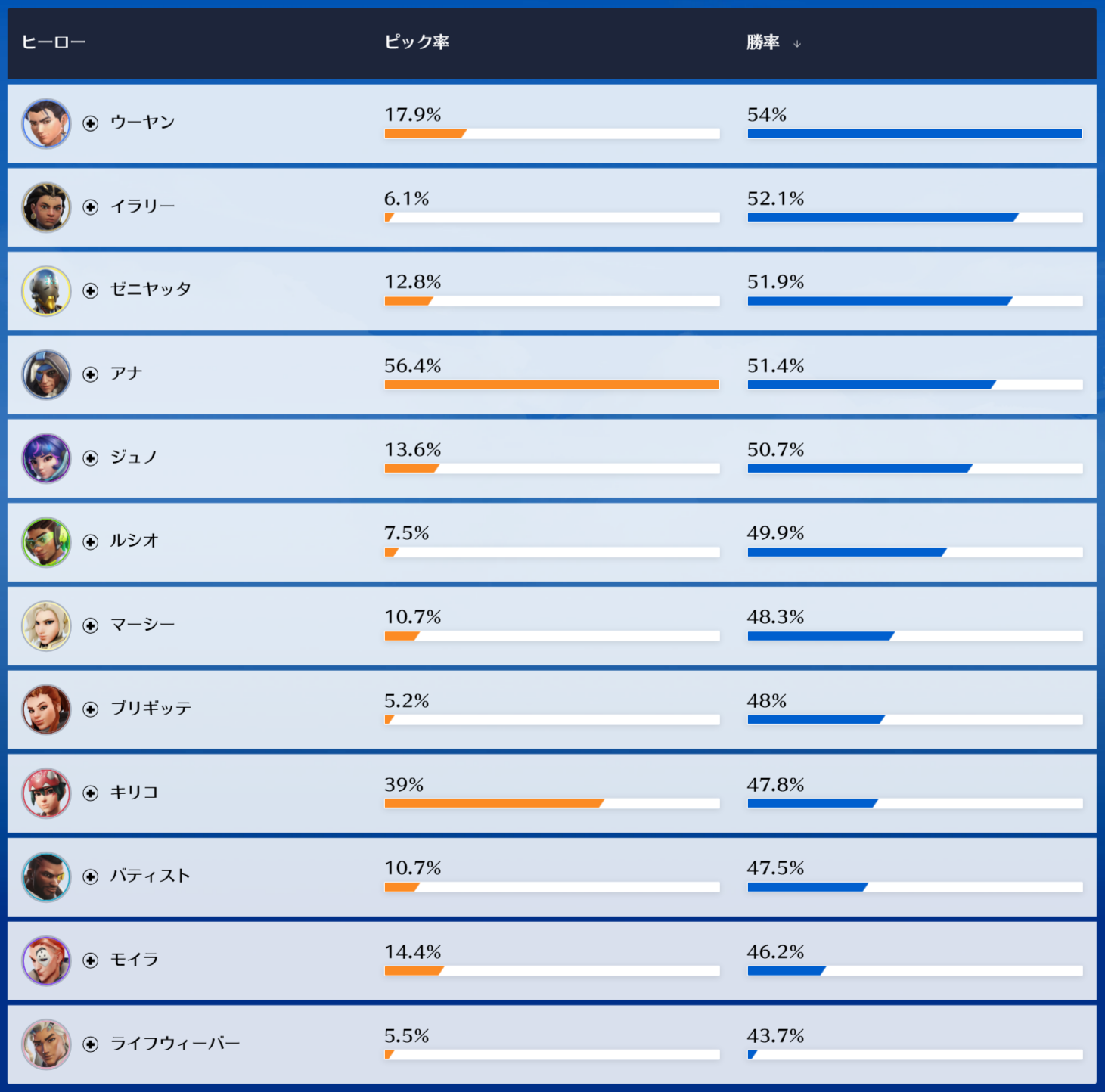 公式統計によると現在の『ヒーローの使用率及び勝率』は現在の下記の様になっているとの事です。