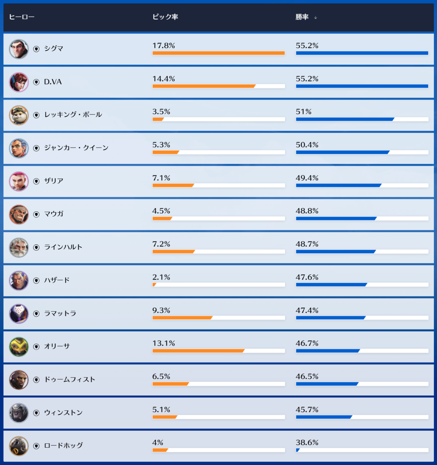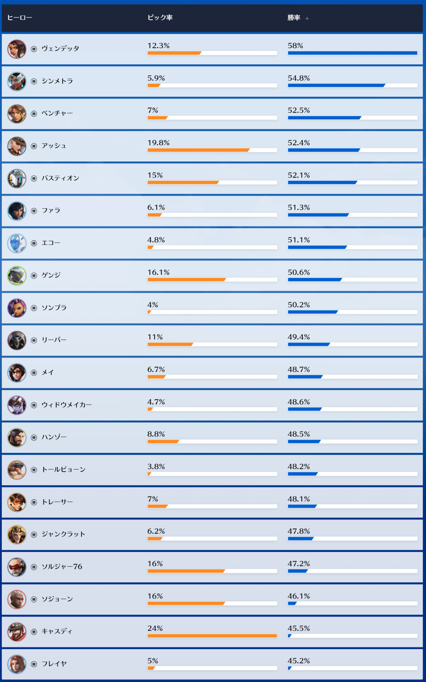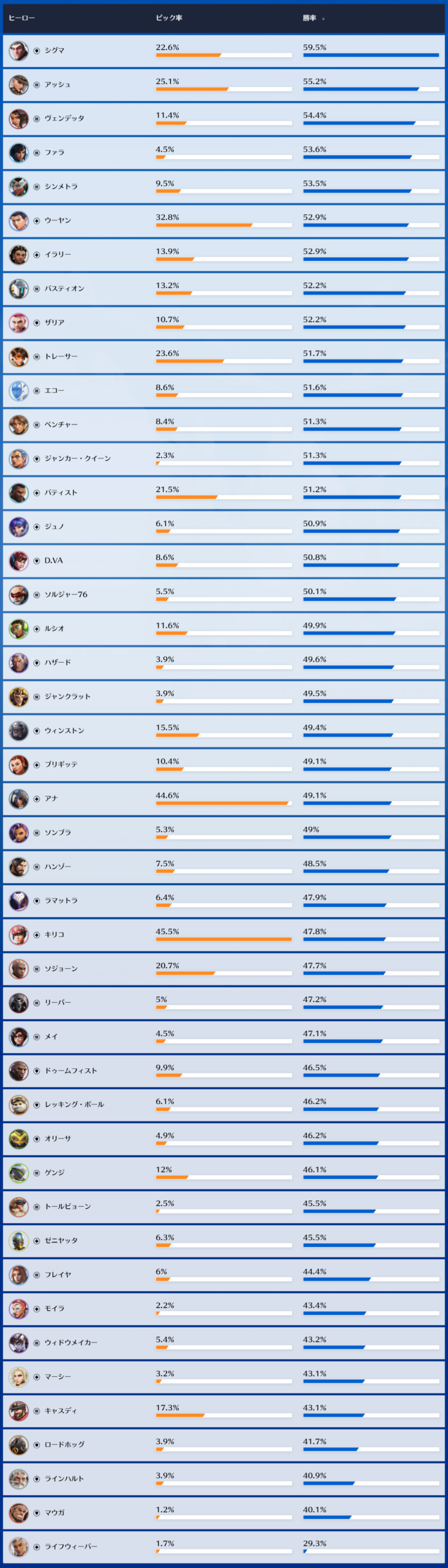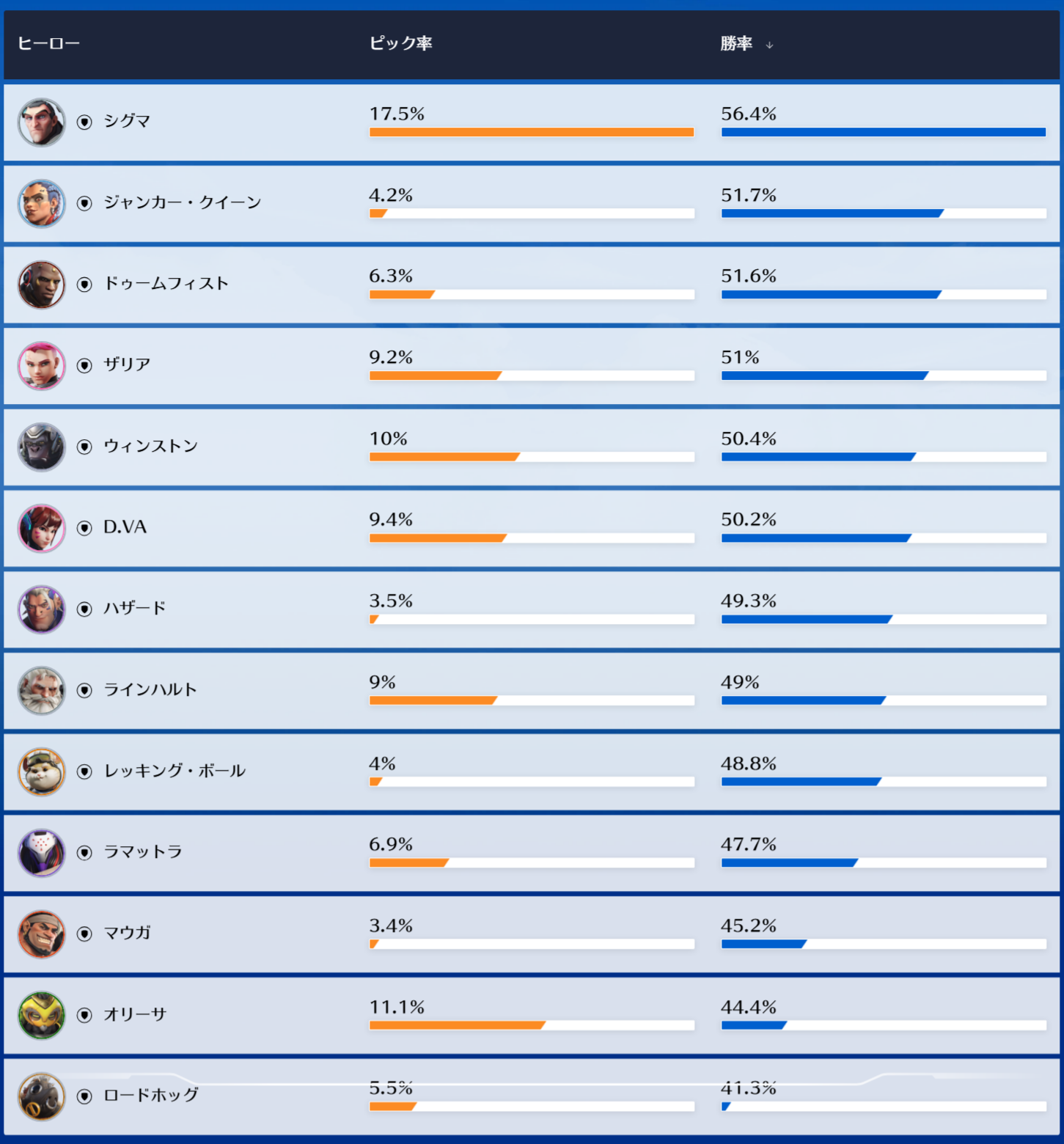 プロとか上位帯の人とかはもはや勝率は関係ないって言ってて、使用率見てるよ