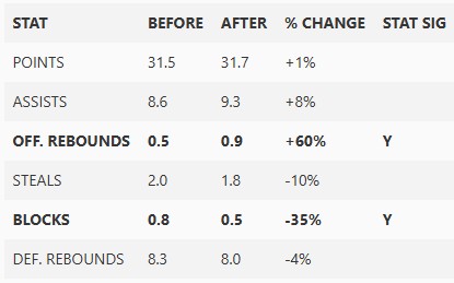 一方で、スティール・ブロック・ディフェンスリバウンドは全て低下 しており、特に ブロックは 35% 減少している(統計的に有意)。