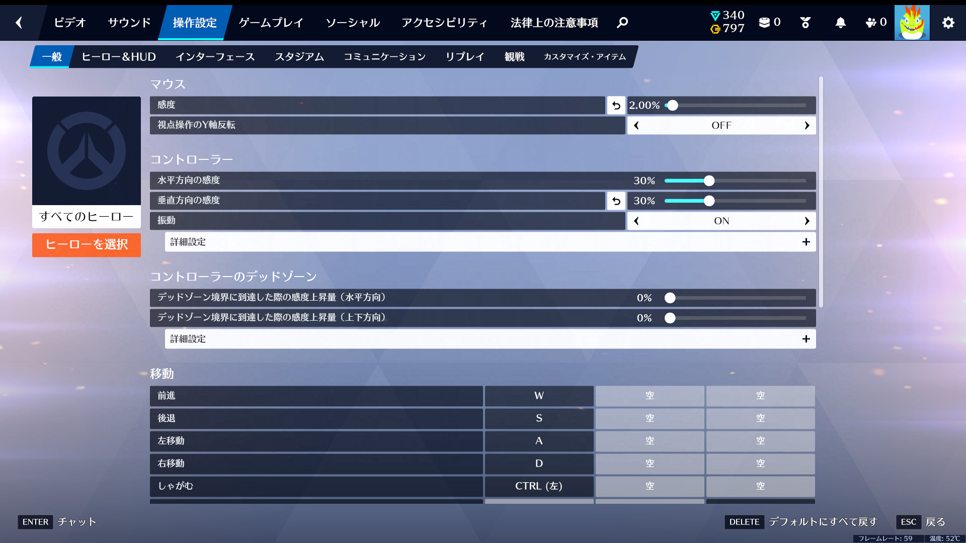 デフォルトのままで始めて問題ありません。ただしインタラクト(F)とスキルキーは早めに把握しておきましょう。ヒーローによってスキルの数が違うので、試合前にキー確認する習慣をつけておくと慌てません。