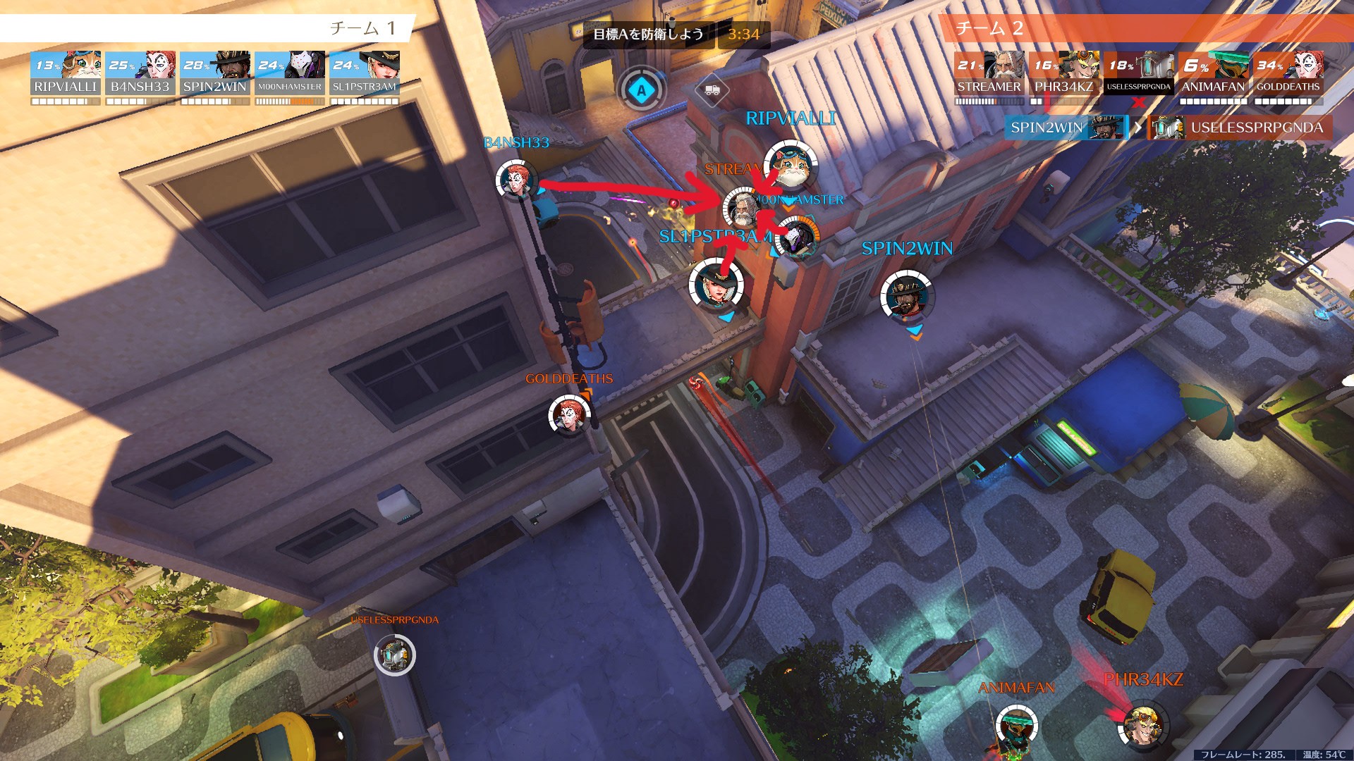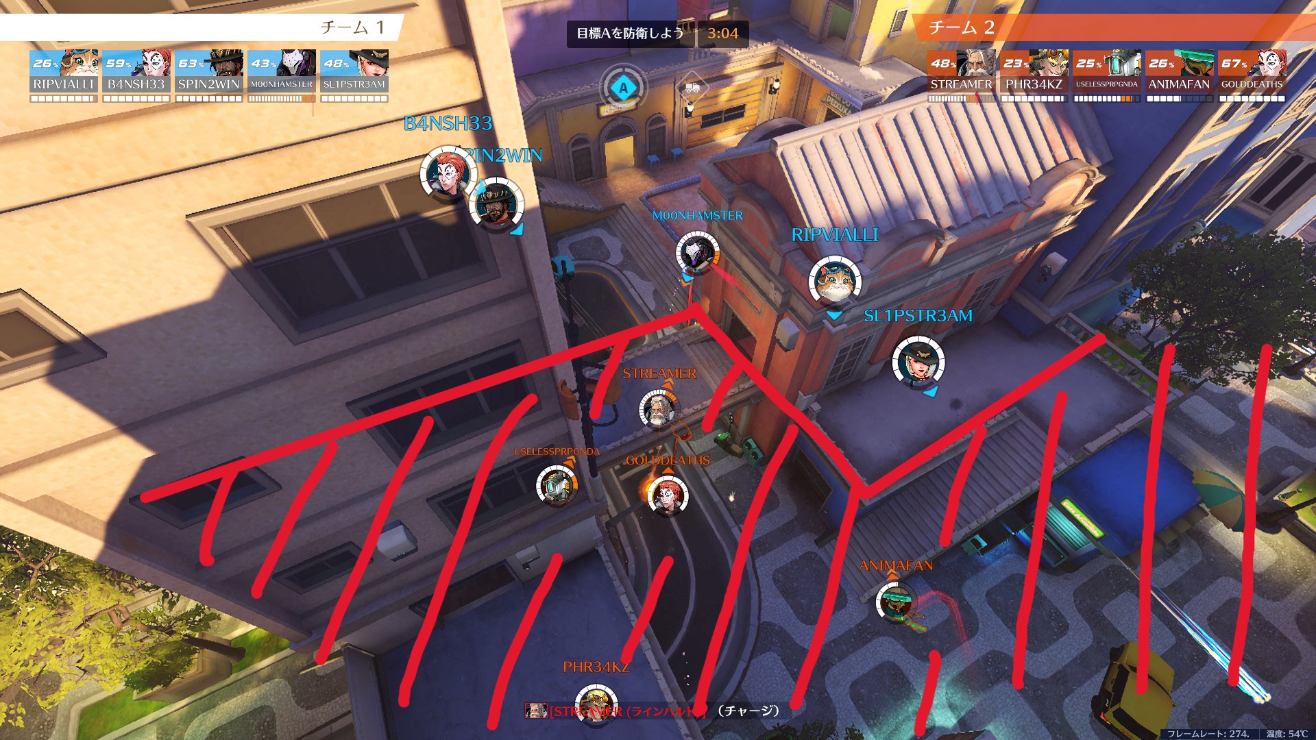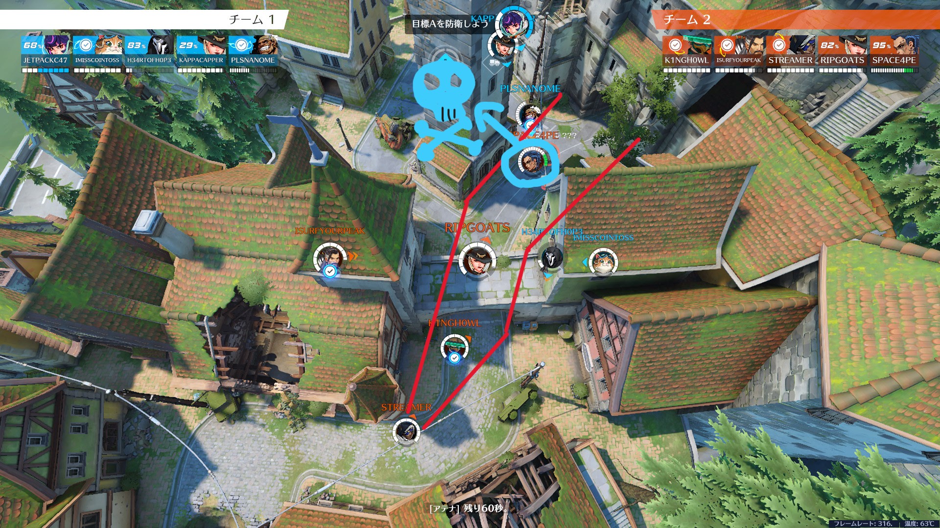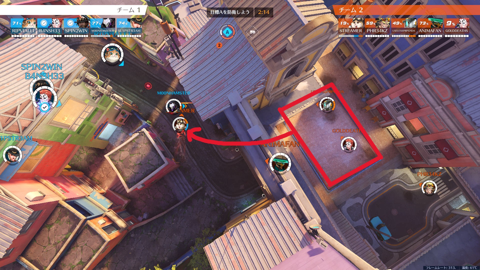 サポートから遠く離れすぎると、ヒールが届かずあっという間に溶けます。前に出たい気持ちはわかりますが、サポートとの距離感を意識しながら前線を維持するのがタンクの基本です。