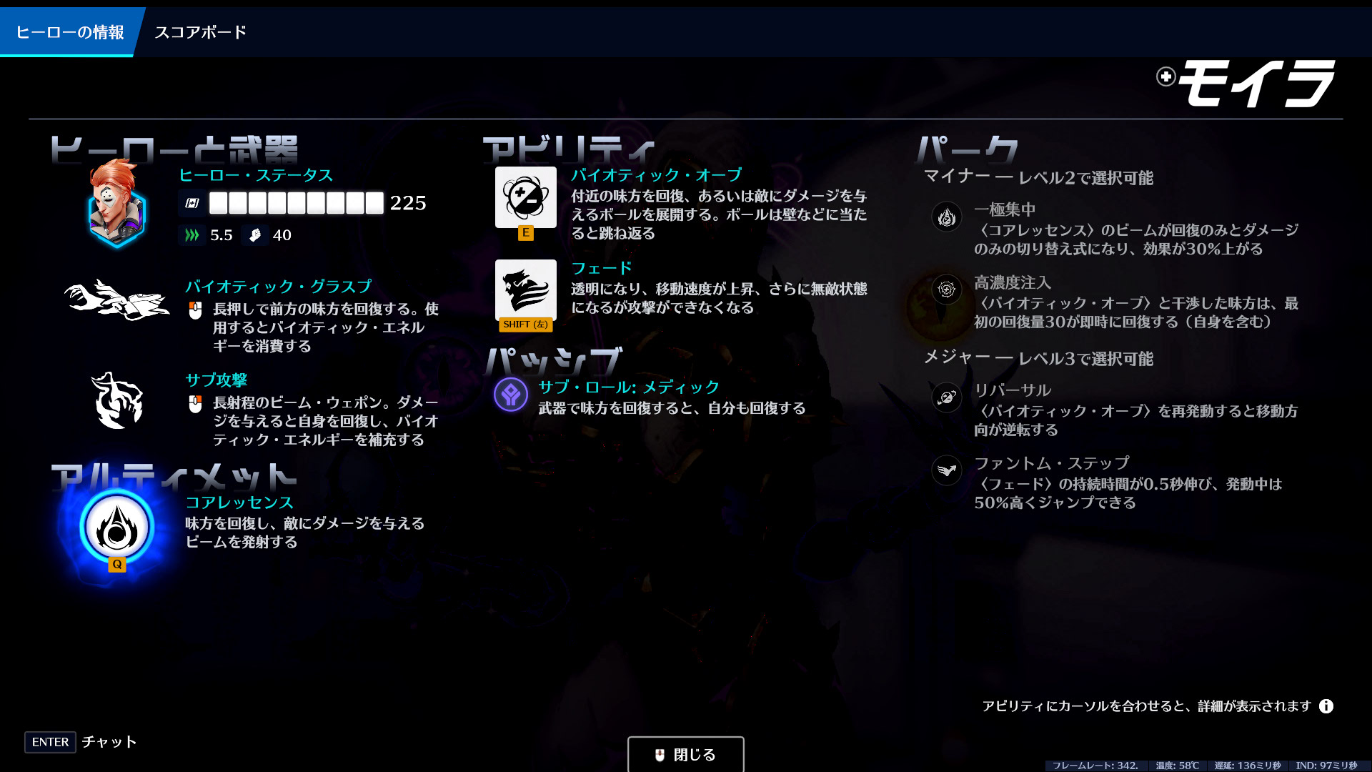 | 強み | 回復量が高く、ヒールしながら自分も回復する。フェードで緊急離脱できる。攻撃はオートエイムでエイム要求が低い |
