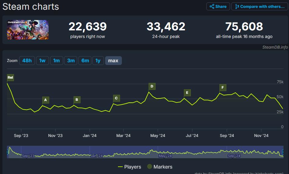 SteamDBによると、オーバーウォッチ2は12月10日にプラットフォーム上の同時プレイヤー数が 16,919 人にまで落ち込み、
