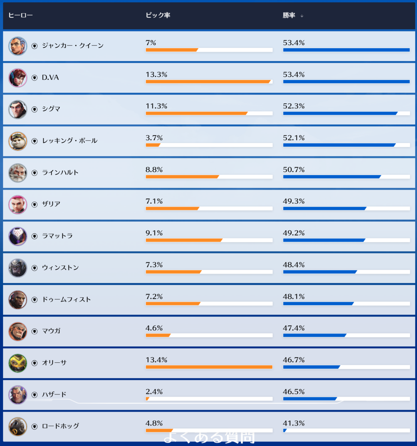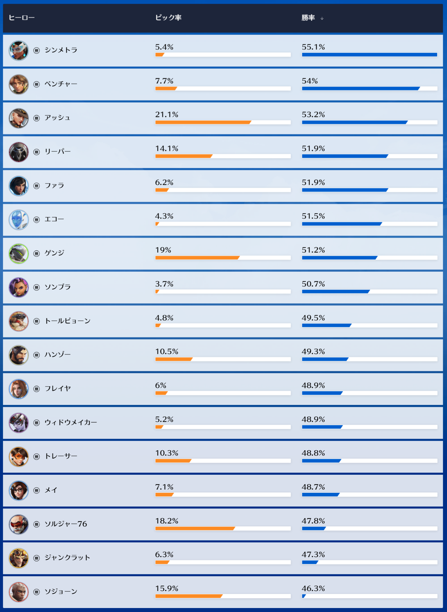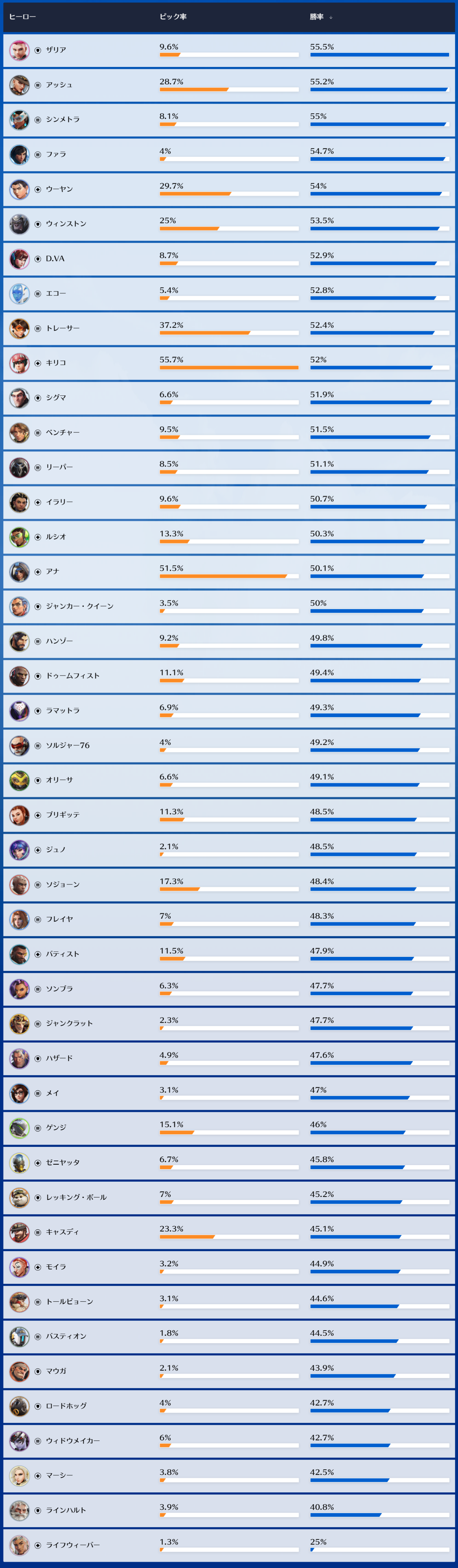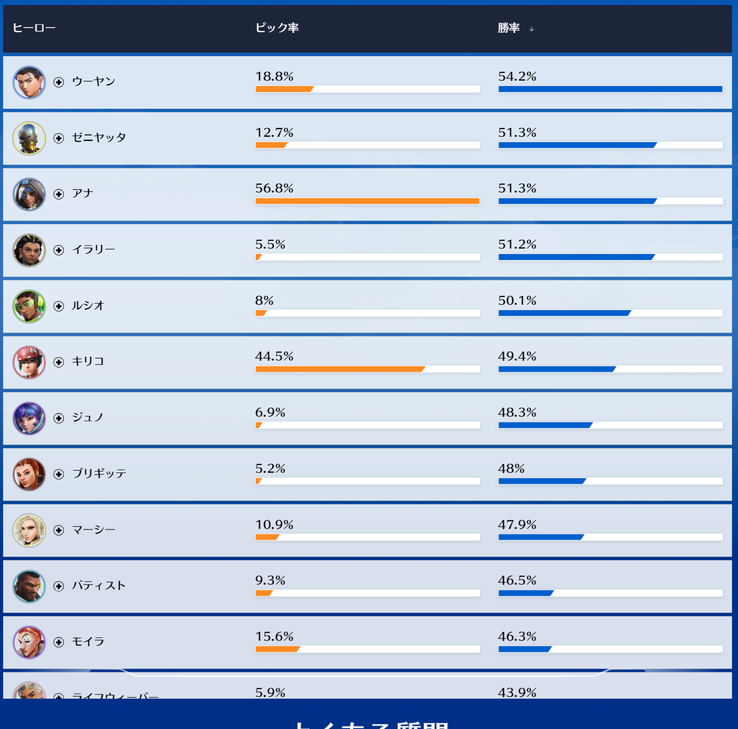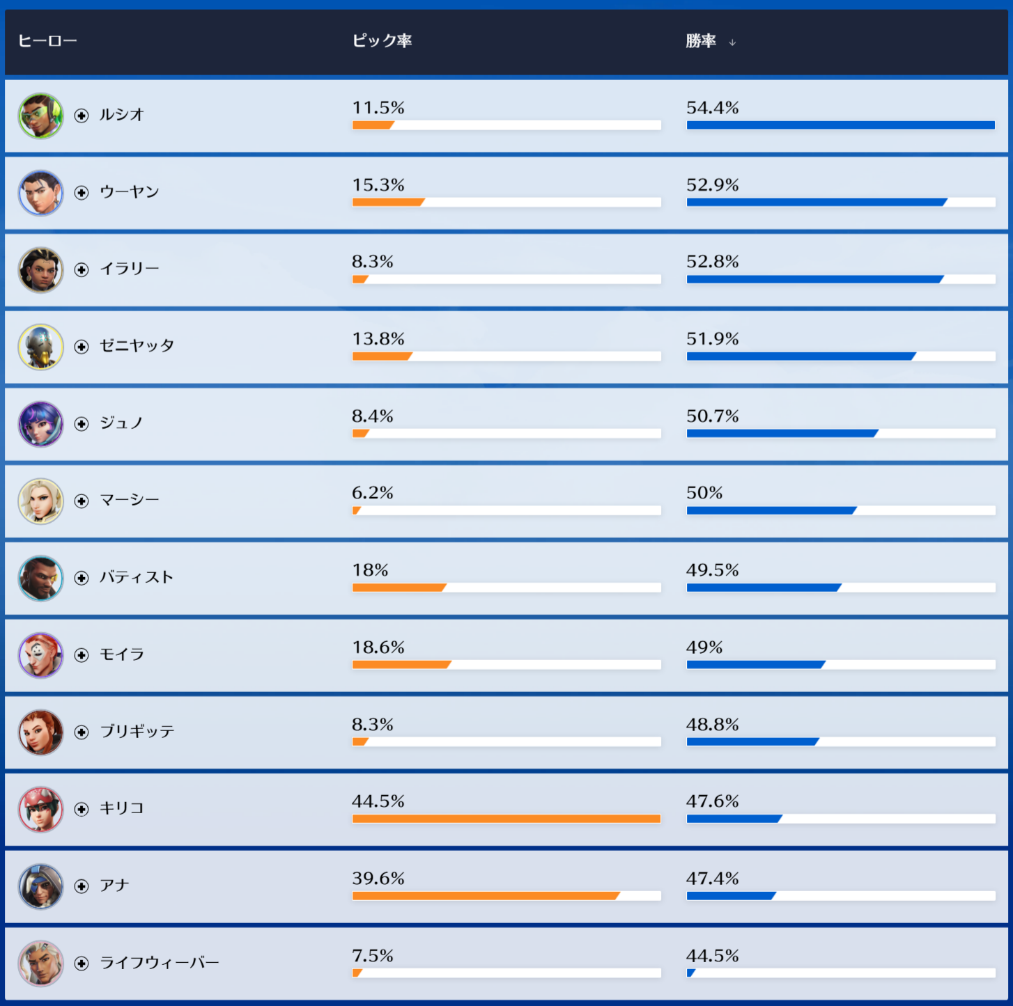 公式統計によると現在の『ヒーローの使用率及び勝率』は現在の下記の様になっているとの事です。