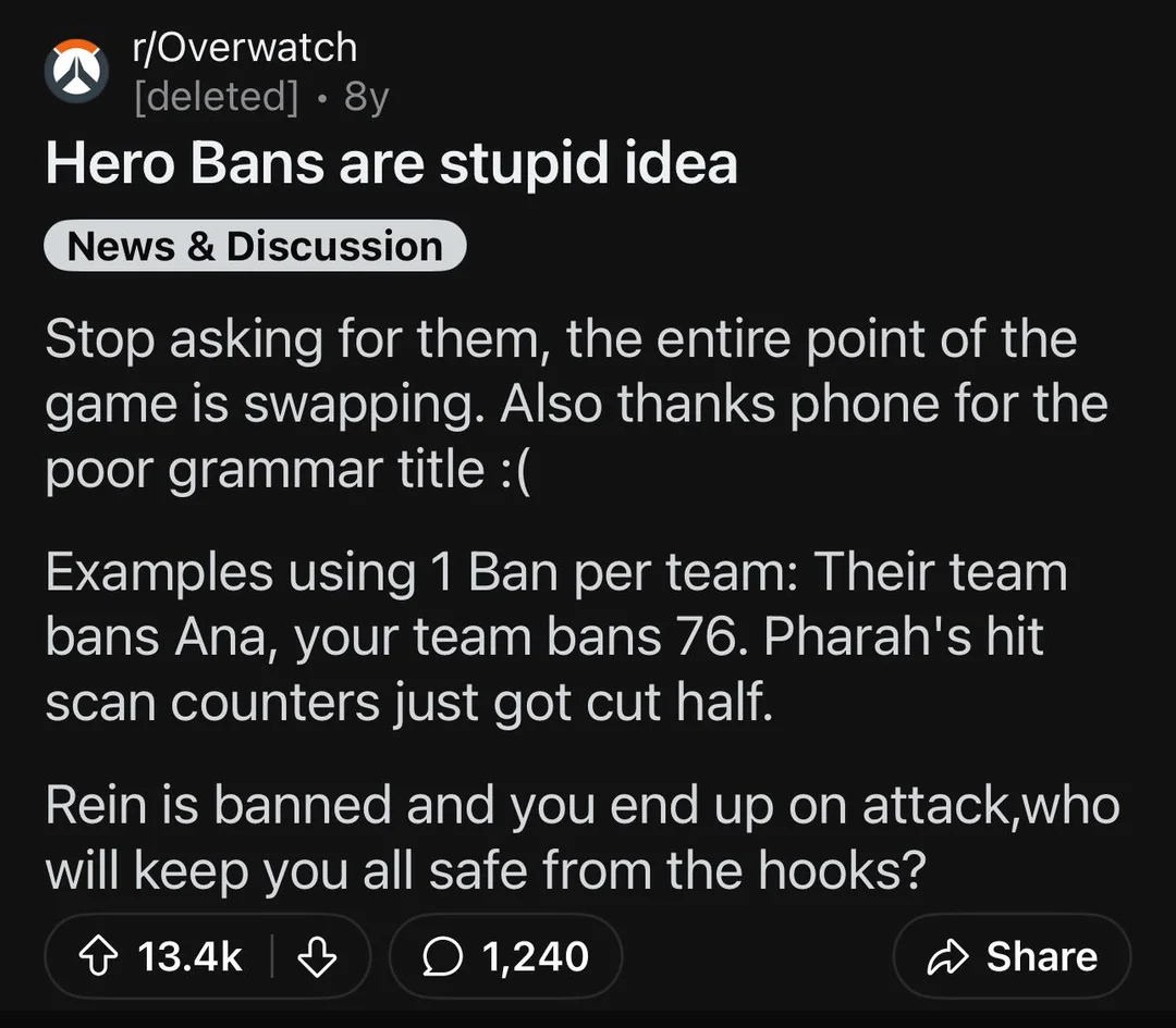 ターゲットBANについては、ヒーローBANは強力なヒーローに対して実行されるべきで、特定の人に対する攻撃などに使われるべきではない。OPまたは煩わしいヒーローをBANし、OTPをターゲットにするべきではない