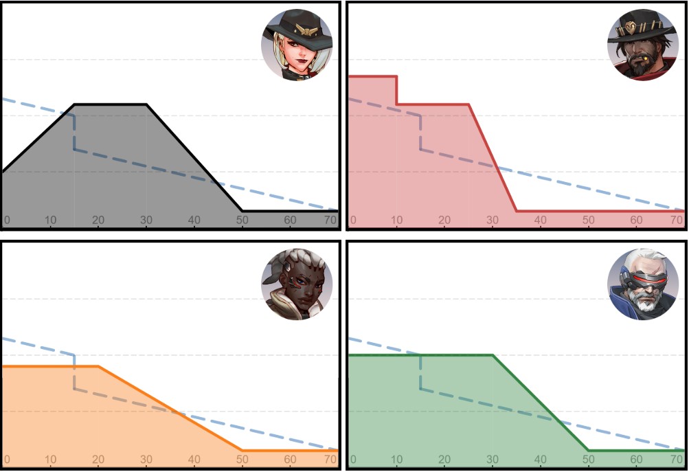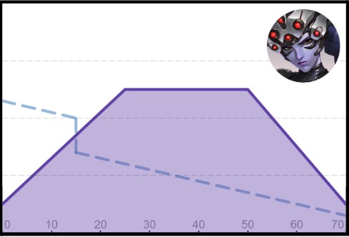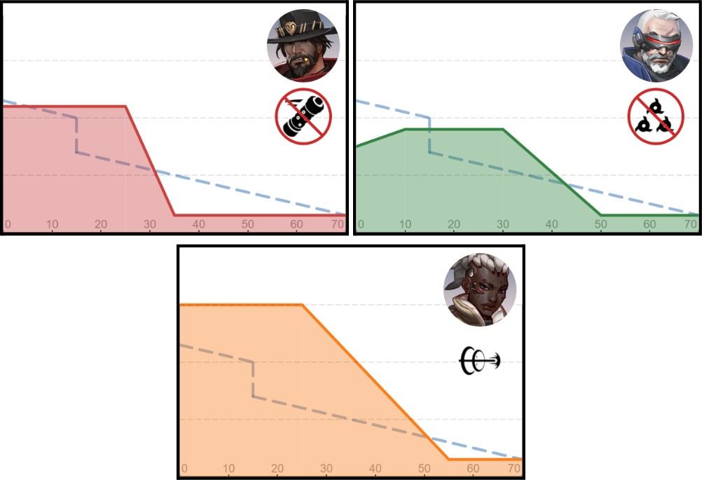長距離戦闘で敵を削り、リソースを引き出し、ウルトチャージを構築するスタイル。ダメージフォールオフがないため、距離からの戦闘に適しています。
